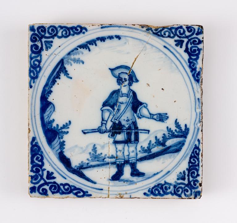 Carreau de revêtement, homme au bâton et à la gibecière, paysage de collines
