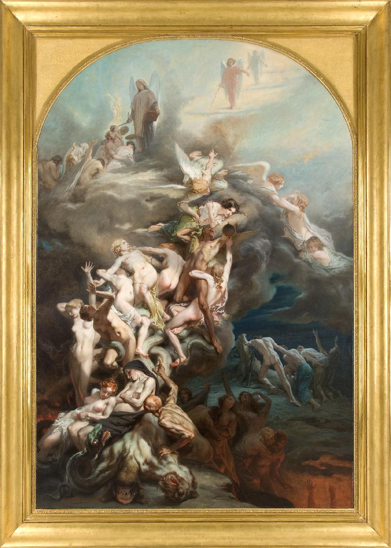 Peintre de la vie de bohème comme de sujets érotiques, de la misère sociale et d’histoires sentimentales, Octave Tassaert est une figure attachante de la peinture française du xixe siècle. Spécialisé dans la lithographie, l’illustration et les petits tableaux de cabinet exécutés pour un cercle d’amateurs restreint, Tassaert ne rencontra jamais le succès espéré. Au fil de sa carrière, le peintre sombre dans la misère et l’alcool et finit par se donner la mort en 1874. Ce destin tragique, de même que la tonalité rêveuse et amère de ses tableaux, n’est pas sans rappeler les poètes maudits Gérard de Nerval (1808- 1855) ou Paul Verlaine (1844-1896). De 1851 à 1853, Alfred Bruyas reconnut en Tassaert un artiste capable d’exprimer sa philosophie esthétique et sa vision messianique de l’art. Ciel et Enfer, une des toiles les plus ambitieuses de Tassaert par son format comme par sa complexité, fut associé à cette vision. Pour cette scène apocalyptique, Tassaert puise dans la tradition flamande, aussi bien dans les représentations du Jugement dernier des peintres primitifs que dans les toiles de Rubens, ce que suggère la plasticité généreuse et énergique des musculatures et des chairs. Les couleurs froides et l’alanguissement des corps en majorité féminins évoquent un mélange d’innocence et de damnation caractéristique de la poésie de Tassaert. Au sein de sa collection, Bruyas donna un rôle décisif à ce tableau et il est possible que Tassaert l’ait modifié après l’avoir cédé à l’amateur montpelliérain. Il est en effet tentant de le reconnaître en haut à gauche, à l’entrée du paradis, tandis que la femme tourmentée observant le spectateur, au centre de la toile, pourrait être une des maîtresses secrètes de Bruyas.