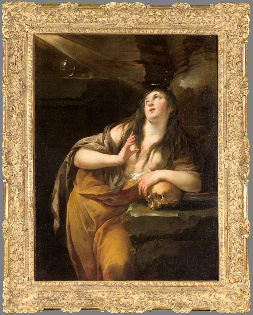 Jacques Blanchard est, avec Simon Vouet, le plus important peintre français sous le règne de Louis XIII. Dès son retour d’Italie en 1629, il s’impose rapidement comme le meilleur peintre du moment, le plus « moderne », et entame une carrière brillante de peintre d’histoire. Blanchard a plusieurs fois abordé le thème de la Madeleine repentante, très répandu à la Contre-Réforme dans le milieu des Carrache, puis en France chez Claude Vignon (1593-1670) et Philippe de Champaigne (1602-1674). La sainte est bien identifiable ici, avec le crâne, la longue chevelure, le flacon de parfum sur le rebord de pierre en haut à gauche (signe de renoncement aux biens terrestres) et le grand faisceau lumineux, signe de sa conversion. Debout, puissamment déhanchée, la sainte est saisie dans l’instantané des transports mystiques et de la conversion : la main droite levée en signe d’acceptation, les yeux levés en direction de la lumière céleste, le bras gauche appuyé presque fièrement sur le crâne. Rarement Blanchard est allé aussi loin dans la recherche de sincérité et de monumentalité baroque. Le drapé et l’abondante chevelure suivent les sinuosités du corps et le peintre exalte avec un pinceau souple et onctueux, digne de Corrège, l’épanouissement des formes féminines comme pour mieux nous pénétrer du mystère de la conversion. Ce chef-d’oeuvre, charnel et mystique à la fois, connu par une gravure de Pierre Daret (1640), jusqu’à sa redécouverte sur le marché de l’art parisien, suivie de son acquisition par le musée, compte parmi les plus belles réussites du « Titien français » vers 1630. La pose maniériste évoque encore à cette date l’art bellifontain comme certaines inventions de Vouet