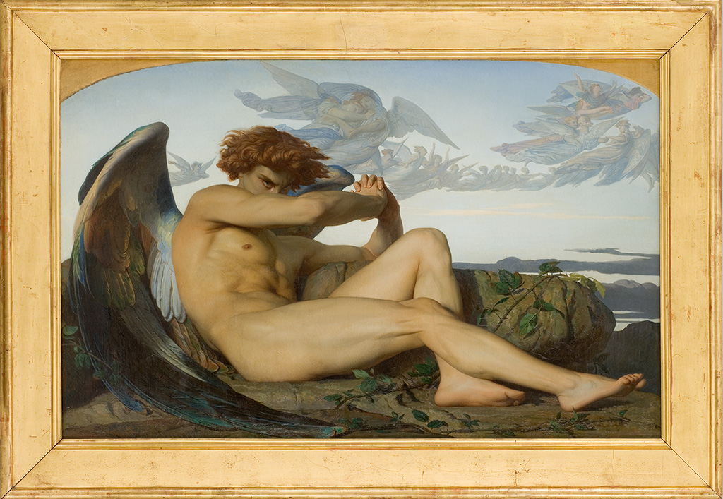 Passé par l’école des beaux-arts de Montpellier puis par les Beaux-Arts de Paris (dans l’atelier de Picot), Cabanel remporte en 1845 le second grand prix qui lui ouvre les portes de la villa Médicis à Rome. Il doit se soumettre comme ses camarades à des exercices obligatoires – les envois de Rome –, pour qu’à Paris les académiciens puissent juger de ses progrès. Après l’immense Oreste en 1846 (Béziers, musée des Beaux-Arts), le jeune pensionnaire se tourne vers un sujet rarement abordé par les peintres, tiré de la Bible (Ézéchiel, Isaïe, Apocalypse de saint Jean) mais repris à l’époque moderne par le poète John Milton dans son Paradis perdu (1667). Cabanel commente lui-même le sujet qui le hante dans une lettre adressée à son ami et mécène montpelliérain Alfred Bruyas : « Je mets en scène deux natures, deux races, l’une inexorablement vouée, prédestinée au mal et au malheur, enfin à tomber ; tandis que l’autre chaste et pure s’élève radieusement vers Dieu en le glorifiant. Or, le principal motif de mon tableau est le génie du mal, Satan ! Sur qui, jadis, Dieu s’était complu à répandre les grâces de la beauté divine ; aujourd’hui puissance brisée courbant la tête devant son créateur et maître, de qui il avait osé se faire rival. Il cache la honte de sa défaite cependant, toujours fier, désespéré, vindicatif. On voit dans le fond du tableau, qui parcourant l’espace [sic], une légion d’anges se berçant dans les airs avec bonheur et ravissement en chantant la gloire de Dieu. Cette opposition de bonheur qui rappelle à Satan sa splendeur passée est à peu près le sujet du tableau. Le tout m’offre des incidences assez poétiques à rendre. » Fidèle à la leçon de l’antique (Torse du Belvédère) et des grands maîtres de la Renaissance (Michel-Ange, Raphaël), Cabanel installe sa figure de grandeur naturelle tout près du rebord de la toile et l’immerge par contraste dans un paysage éthéré, presque abstrait, tout en harmonies de gris et de bleu lilas. L’effet est saisissant avec l’aile sensuelle servant de couche et le visage ténébreux à demi masqué par le bras droit. Le maniérisme de la pose, la recherche obstinée d’originalité, le pathos fiévreux déplurent aux membres de l’Académie qui se montrèrent quelque peu effarouchés par l’esprit d’indépendance du peintre. « Enfin je suis pour eux maintenant une espèce de renégat de leur école », confie-t-il encore à Bruyas. Juste retournement des choses, ce tableau de jeunesse compte aujourd’hui parmi les créations les plus fascinantes et populaires de cet artiste promis à un brillant avenir.