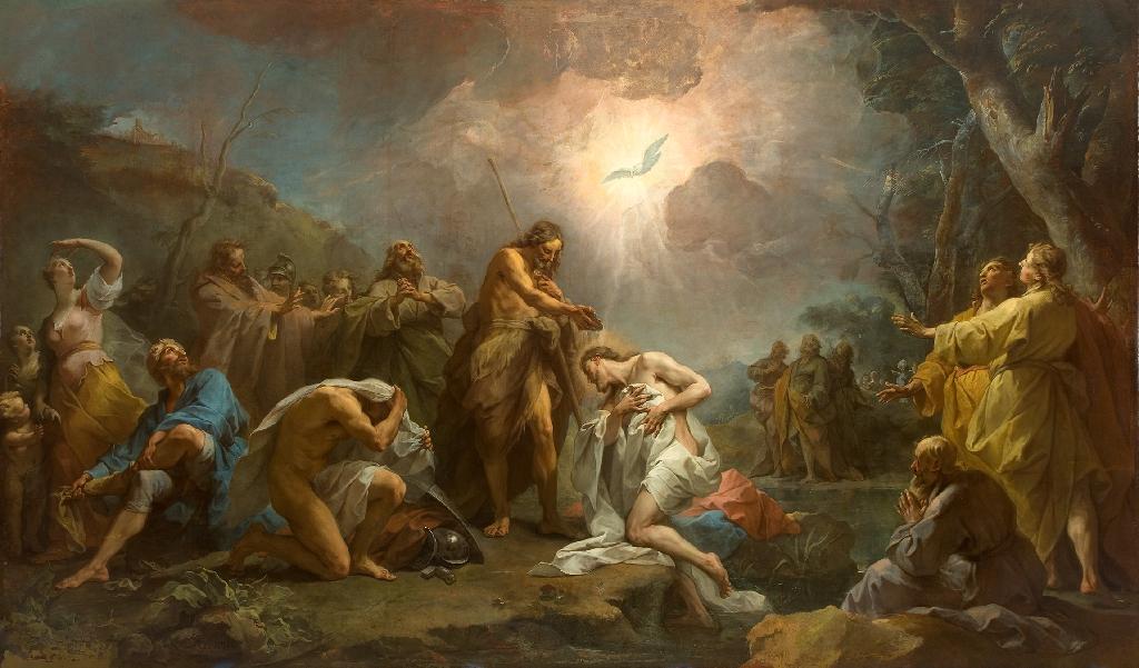 Ce tableau est un carton de tapisserie pour la Tenture du Nouveau Testament, commandée par la direction des Bâtiments du roi et terminée en 1757. Cinq tentures seront tissées jusqu’à la veille de la Révolution. Restout avait travaillé à d’autres cartons de cette tenture : La Cène (détruite), commencée en 1711 par son maître Jean Jouvenet (1644-1717) et qu’il achève après sa mort, puis Le Christ guérissant les malades (1725, Lille, palais des Beaux-Arts). Par rapport à ces cartons, Le Baptême du Christ doit moins à Jouvenet, dont les compositions et les figures ont une solidité classique, et montre au contraire l’inventivité et l’originalité de Restout. La tenture sera achevée en 1757 avec Le Lavement des pieds (détruit). Les personnages de Restout ont une grâce dansante et une spiritualité exaltée qui ont fait de lui le peintre religieux le plus original du xviiie siècle rococo français, période qui ne fut pas seulement celle des pastorales et des mythologies mais qui connut une intense production religieuse. Au service d’une foi sûre et charnelle, l’exécution est très séduisante, voire sensuelle, avec ses effets de moelleux, de transparence des couleurs pastel très raffinées. La composition par petits groupes de figures habilement disposés en profondeur est animée d’un souffle violent, tandis que l’irruption de la lumière du Saint-Esprit crée des effets de fulgurance. Ce sentiment d’agitation fébrile un peu fantastique exprime bien la révélation de la présence divine.