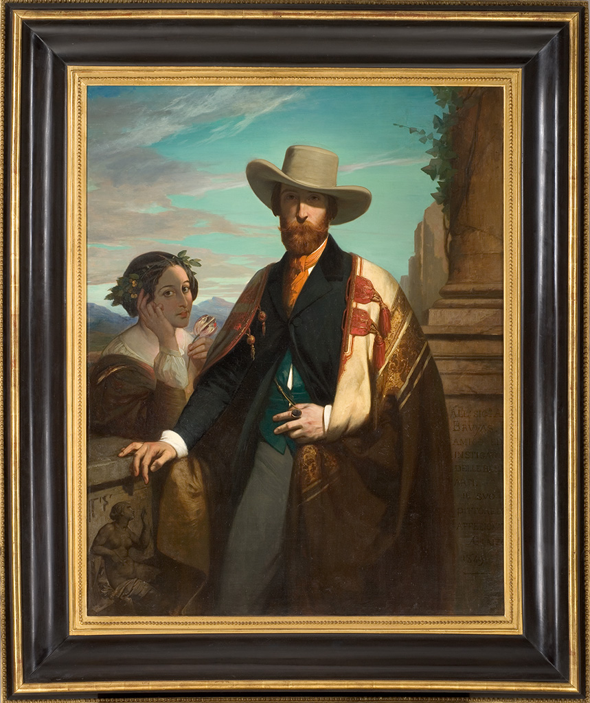 Peintre en grande partie autodidacte, formé dans l’atelier d’Achille (1800-1857) et Eugène (1805-1865) Devéria, Auguste Glaize a connu une honnête carrière de peintre officiel, recevant régulièrement des distinctions au Salon avec de vastes compositions historiques ou religieuses. L’État lui achète en 1846 Le Sang de Vénus pour le déposer au musée Fabre, où le tableau constitue alors l’un des rares témoignages de la peinture contemporaine. Actif à Montpellier à la fin des années 1840 et au début des années 1850, Glaize reçoit des commandes pour les églises (chapelle de la Miséricorde, église Saint- Roch, église Saint-Denis) et exécute des portraits pour la bourgeoisie locale. Le jeune Alfred Bruyas, qui débute alors sa collection, engage avec Glaize une collaboration durable. L’artiste sera le seul à suivre Bruyas tout au long de la vie du collectionneur, livrant plusieurs portraits de lui, dont un dernier quelques semaines avant sa mort. Avec Glaize, Bruyas trouve un peintre fidèle, qui ne rechigne pas à traduire en peinture ses mises en scènes les plus baroques, comme le prouve ce Portrait d’Alfred Bruyas, dit Le Burnous. Après deux séjours en Italie en 1846 et 1848, Bruyas souhaite disposer d’un portrait d’apparat reflétant sa nouvelle ambition, qui ne se réduit pas à l’image du jeune amateur provincial dont Glaize avait livré le portrait en 1848, ni à celle du fils prodigue étonnant ses concitoyens sous le regard bienveillant de son père, dépeint la même année dans L’Intérieur du cabinet Bruyas (les deux toiles sont conservées au musée Fabre). Instruit par l’exemple des grands princes de la Renaissance, Bruyas se plaît à se présenter comme un « nouveau Médicis », un protecteur des arts dont le territoire s’étend au vaste monde. Si la jeune femme couronnée de laurier à ses côtés personnifie l’Italie, la tulipe et le châle – cadeau rapporté par son ami peintre Jules Laurens d’un voyage en Perse – symbolisent un Orient dont la vogue va croissante, alors que le chapeau de Panama renvoie aux Amériques. Au-delà de la Renaissance, Bruyas s’inscrit dans la continuité d’un Empire romain à son apogée, ce que traduisent ici la bague composée d’une intaille romaine ostensiblement montrée ainsi que les ruines antiques qui complètent le décor : le bas-relief sur lequel Bruyas s’appuie montre une figure féminine, le regard tourné vers ce dernier, dans une attitude de remerciement, et le socle de la colonne de droite porte une dédicace laudative gravée en lettres romaines, comme sur une dalle antique. On remarquera le possessif « son peintre et affectionné », qui situe la relation entre les deux hommes dans la tradition du peintre courtisan et du mécène. Majestueux, Bruyas apparaît ici au sommet de sa puissance et de son ambition, loin de l’image torturée et souffrante qu’il donnera par la suite dans le Portrait en Christ couronné d’épines peint par Marcel Verdier (1817-1856) (1852, musée Fabre).