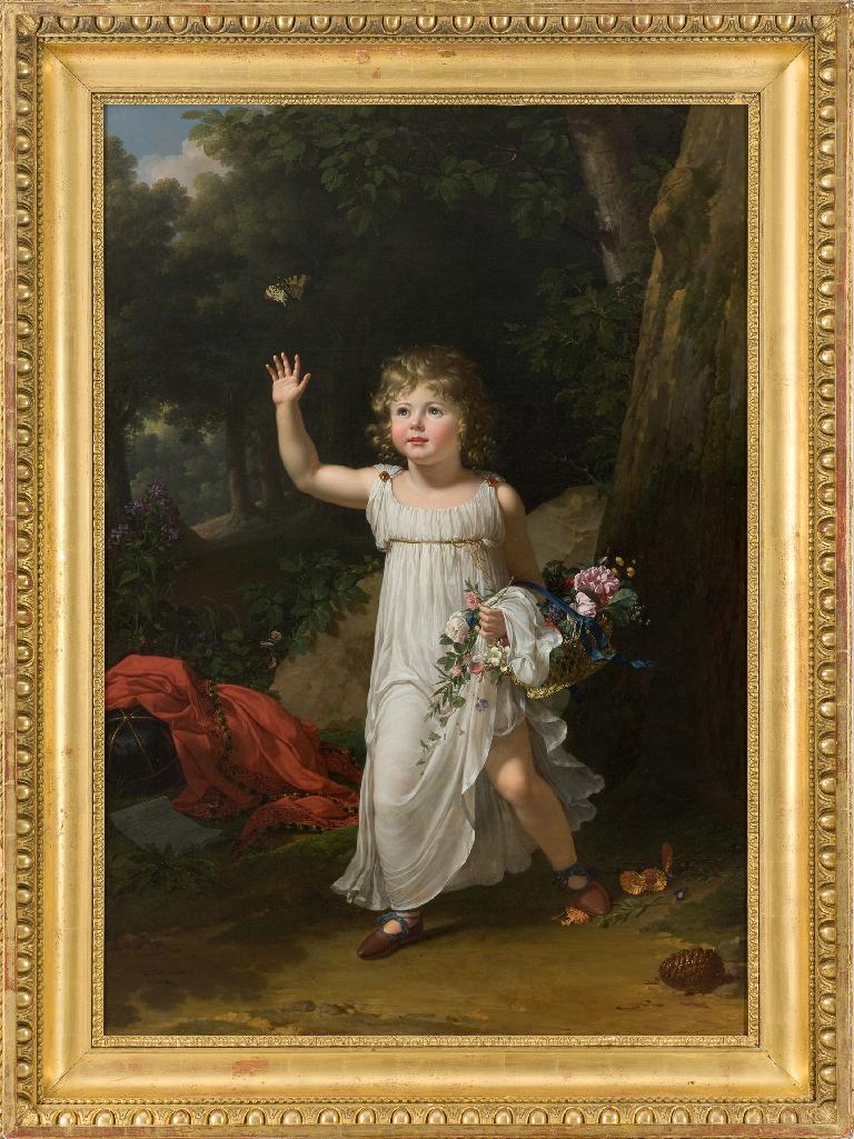 Entré dans les collections l’année même de la grande rétrospective « François-Xavier Fabre (1766- 1837). De Florence à Montpellier » organisée au musée, ce portrait permet de mesurer la notoriété de l’artiste en Toscane moins de dix ans après son installation en 1793. Le général Clarke (1765-1818), futur ministre de la Guerre de Napoléon, arrive à Florence en 1801 et commande l’année suivante à Fabre, qu’il admire, le portrait de son fils aîné Edgar, âgé de trois ans. L’artiste met en scène dans un sous-bois le garçonnet vêtu d’une fine tunique à l’antique, retenue aux épaules par deux petites fibules et à la poitrine par un lacet doré ; il vient de ramasser des fleurs et se laisse distraire par un papillon coloré qui le fascine. De la corbeille suspendue à son bras gauche s’échappent plusieurs variétés de fleurs : pivoines, roses, zinnias, reinesmarguerites, pois de senteurs. Près du rocher à gauche, on distingue d’autres fleurs, pâquerettes, violettes, monnaies-du-pape parmi les herbes sauvages. La clé du tableau réside dans une petite feuille de papier dissimulée dans l’herbe près de la draperie rouge. On peut y lire : « Aux auteurs de mes jours. / Quand serai grand, de fleurs puissé-je ainsi semer / Tous les momens de votre vie ; / Soucis font mal, dit-on, pour vous en préserver / Je les détruis dans la prairie. » De fait, Edgar piétine quelques fleurs de soucis à droite. Le papillon, symbole de l’immortalité de l’âme, la pomme de pin, symbole de puissance vitale et de fécondité, renforcent encore le caractère érudit de la toile. Fabre reprend ici avec une ampleur nouvelle les formules de son ami Louis Gauffier, spécialiste du portrait aristocratique dans un cadre champêtre. Comme lui, il recherche un subtil équilibre entre poésie naturaliste, élégance mondaine et préciosité des détails : rarement Fabre est allé aussi loin dans le rendu des belles matières tactiles, des détails précieux enlevés avec un soin quasi hollandisant. Pour l’évocation de ce parc romantique, Fabre s’est servi de ses études sur le motif exécutées vers la même période au parc des Cascine aux portes de Florence où il avait l’habitude de se rendre. Clarke se montrera très satisfait du portrait de son fils et commandera à Fabre son propre portrait en 1810 (Nantes, musée d’Arts) ainsi que celui de son épouse entourée de ses quatre enfants, dont Edgar qui apparaît cette fois en costume de page de la Renaissance (Paris, musée Marmottan-Monet).