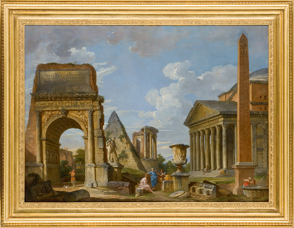 Ce tableau est, avec Loth et ses filles de l’Albane, la seule peinture italienne donnée par Antoine Valedau. Il appartient à la veine des caprices de ruines antiques qui rendirent Pannini célèbre. Très proche du milieu français à Rome, en particulier de l’ambassadeur de France Melchior de Polignac, puis du directeur de l’Académie Charles Joseph Natoire (1700-1777), Pannini influence de manière décisive Hubert Robert (1733-1808), arrivé en 1754. Pannini réunit ici avec fantaisie quelques-uns des monuments les plus fameux de la Rome antique : l’arc de Titus, la basilique de Maxence dans le fond, la pyramide de Cestius et la sculpture de l’Hercule Farnèse, le temple de la Sibylle de Tivoli, le vase Borghèse, le Panthéon et un obélisque, peut-être celui d’Héliopolis, situé place du Peuple. Il a réutilisé à plusieurs reprises ces monuments dans d’autres agencements (à Oberlin, à Leipzig, à Indianapolis, etc.). La composition du tableau de Montpellier est très aérée, offrant des échappées entre les ruines avec une respiration et une ampleur parfois absentes de certains tableaux plus chargés et touffus, tel celui d’Indianapolis. Les personnages aux costumes antiques donnent la proportion réelle des monuments de l’Antiquité païenne qui les entourent et le groupe central semble composer une scène de prédication de saint Pierre. Pannini se situe bien dans la continuité du paysage romain orienté dès 1700-1710 par Jan Frans van Bloemen, dit Orizzonte (1662-1749), puis par Andrea Locatelli (1695-1741) : clarté générale, coloris vifs, peu d’effets de contraste entre ombre et lumi