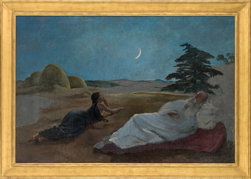 Ce tableau de grand format constitue le testament artistique du peintre. Dans la solitude de son dernier été montpelliérain, Frédéric Bazille poursuit plusieurs oeuvres comme il l’écrit à son ami Edmond Maître le 2 août 1870 : « J’ai fini à peu près un grand paysage (églogue), une étude de jeune homme nu, Ruth et Booz sont à moitié en chemin. » Pour la première fois l’artiste, pétri de culture protestante, s’empare d’un thème tiré de l’Ancien Testament déjà traité avant lui, notamment par Nicolas Poussin (cycle des Saisons, musée du Louvre). Au xixe siècle, plusieurs artistes reviennent sur le sujet : Jean-François Millet, dans son Repos des Moissonneurs (1853, Boston, Museum of Fine Arts) initialement intitulé Ruth et Booz ; Pierre Puvis de Chavannes, avec l’immense toile Le Sommeil du Salon de 1867 (Lille, palais des Beaux-Arts) ; enfin, Alexandre Cabanel dans une composition exécutée vers 1868, malheureusement perdue mais connue par une réduction au musée Fabre. Comme son compatriote Cabanel, Bazille fait référence au poème de Victor Hugo, publié en 1859 dans La Légende des siècles : « Donc, Booz dans la nuit dormait parmi les siens ; Près des meules, qu’on eût prises pour des décombres. […] Ruth songeait et Booz dormait ; l’herbe était noire ». Bazille suit fidèlement les vers du poète, qu’il admire, et peint un Booz endormi, appuyé sur son bras gauche, avec à ses côtés Ruth, allongée, la tête relevée en direction de la « faucille d’or dans le champ des étoiles ». Sur la gauche, au second plan, apparaissent quatre meules de foin, tandis qu’à droite se dressent un beau cèdre bleu et quelques pins parasols, à l’évidence inspirés par le paysage de Méric. Pour mener à bien ce sujet inédit dans son parcours, Bazille a multiplié les études d’ensemble et de figures isolées d’après le modèle, et a emprunté à Puvis de Chavannes les traits généraux de la composition en largeur, de même que l’impression de calme grandeur qui émane de la toile. L’espace du tableau demeure largement ouvert, le regard circule avec aisance entre les foins. C’est de l’intérieur, à partir du poids physique des personnages, que naissent la méditation et la rêverie. L’enveloppe de bleu profond, les formes comme pétrifiées, le paysage résiduel favorisent la communion intime des figures avec la nuit. On n’a pas manqué de s’interroger sur les orientations nouvelles de Bazille, associé étroitement jusque-là aux recherches des adeptes de la Nouvelle Peinture d’Édouard Manet. En fait, malgré son sujet d’histoire, le tableau s’inscrit dans la continuité de l’oeuvre par sa franchise de ton, son humanité, sa facture à la fois économe et souple, et par sa poésie pleine de pudeur et de sensualité mêlées. En 2015, une radiographie de la toile a révélé la composition sous-jacente de la Jeune fille au piano, refusée au Salon de 1866, et jusqu’alors réputée disparue.