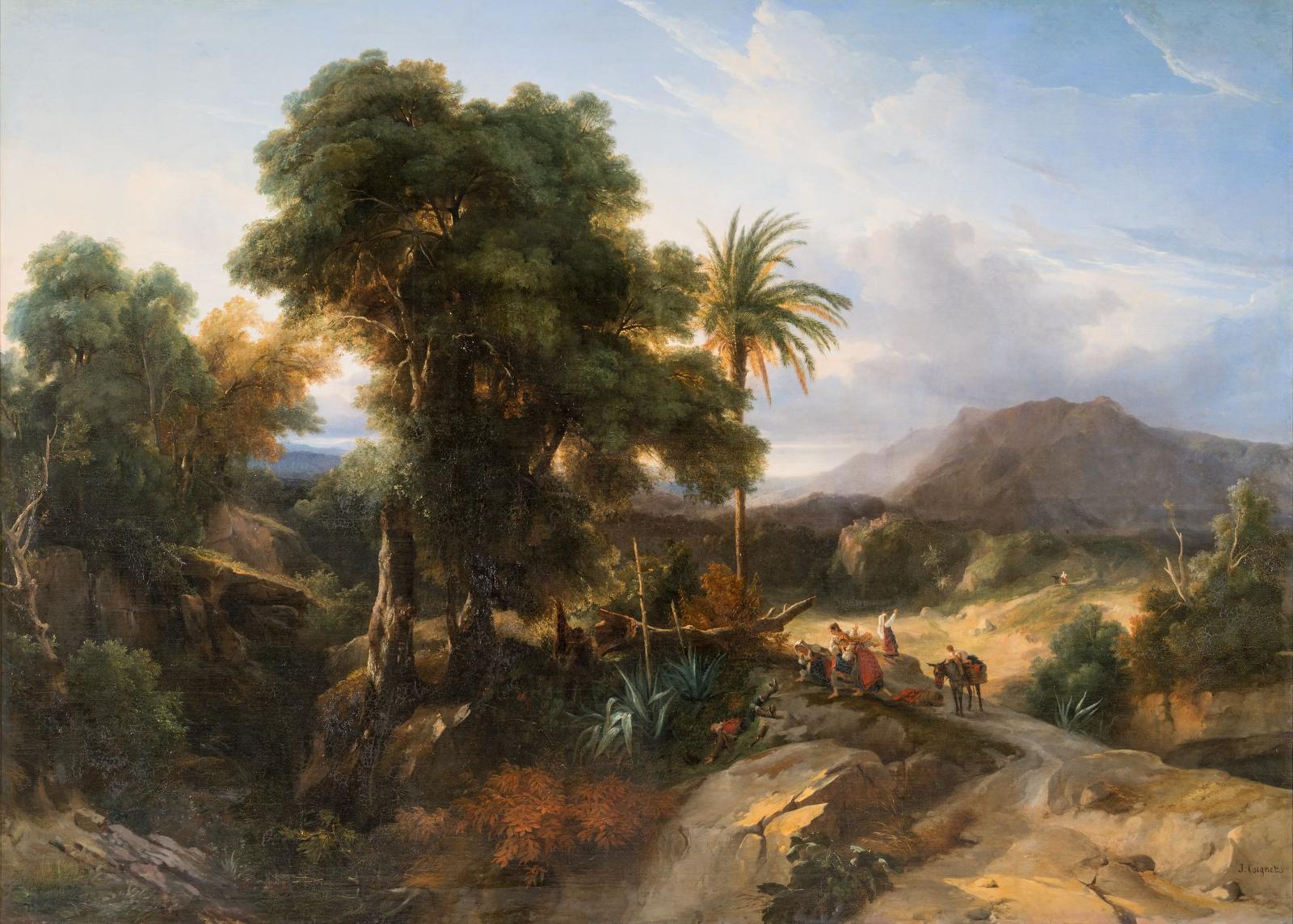 Jules Coignet, formé par Jean Victor Bertin (1767- 1842) et marqué par la leçon à la fois naturaliste et classicisante de Pierre Henri de Valenciennes, illustre bien le renouvellement de l’art du paysage durant le deuxième quart du xixe siècle, entre le pittoresque des sites, la dramatisation de la mise en scène et le classicisme de la composition, au même titre qu’Édouard Bertin ou Charles Rémond. Coignet concourt à la deuxième édition du grand prix du paysage historique de 1821, remporté par Rémond. Dès lors, l’artiste renonce aux sujets d’histoire et, en peintre voyageur, parcourt de multiples contrées encore méconnues du public des Salons parisiens. Il se rend en Italie, mais aussi en Auvergne, en Normandie, en Bretagne, dans les Vosges, au Tyrol, en Allemagne, ainsi qu’en Orient – Égypte, Syrie et Asie mineure –, de 1844 à 1846. Notre tableau fut présenté au Salon de 1827, à la suite d’un voyage en Italie que fit Coignet au début des années 1820 et de la publication de ses Vues pittoresque de l’Italie en 1825. C’est une partie méconnue de la péninsule que le peintre présente ici, la Calabre, marquée par une végétation exotique – palmiers, agaves – et par une ambiance désertique, aride et sauvage, bien éloignée de la campagne romaine ou des sites toscans et campaniens. Les voyageurs, en costume traditionnel, le personnage tombant dans un ravin notamment, apportent un caractère pittoresque et anecdotique au coeur d’un paysage noble et majestueux