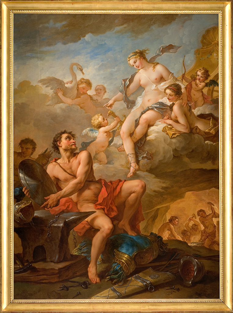 À son retour de l’Académie de France à Rome, Natoire est reçu à l’Académie royale en 1734 avec ce tableau au sujet tiré de l’Énéide de Virgile (VIII, 370- 410). Arrivé en Italie, Énée doit combattre Turnus, le roi des Rutules ; la mère d’Énée, Vénus, vient alors demander à son époux Vulcain de forger des armes pour lui et le charme dans leur chambre nuptiale. Le sujet est propice à peindre un tableau exemplaire de l’évolution contemporaine vers un art sensuel et voluptueux au détriment de thèmes plus sérieux. François Boucher (1703-1770), à ce moment seul rival de Natoire dans ce style galant, avait d’ailleurs peint en 1732 un tableau de même sujet, conservé au musée du Louvre. La composition de Natoire, organisée sur une diagonale, est calquée sur celle de Boucher. Mais si les personnages représentés par celui-ci expriment un désir amoureux bien venu, la Vénus de Natoire prend un ton impérieux, celui d’une reine s’adressant à son vassal. Au demeurant, Boucher, qui répondait à la commande d’un particulier – François Derbais – avait plus de liberté et de licence que Natoire, peignant pour l’Académie. L’élégante arabesque du dessin de Natoire, la grâce de ses femmes inspirée de Corrège, si typiques avec leur nez fin et leurs lèvres menues, la tonalité chaude qui évoque la « chambre nuptiale toute d’or » décrite par Virgile suppléent efficacement à la relative froideur des expressions des dieux. Les esquisses à l’huile du musée de l’Ermitage à Saint-Pétersbourg et du Snite Museum of Art à Notre Dame (Indiana), les dessins conservés à la Bibliothèque nationale de France à Paris et à l’Albertina de Vienne témoignent de l’attention portée par Natoire à cette oeuvre qui lui offrait l’occasion de se mesurer à Boucher