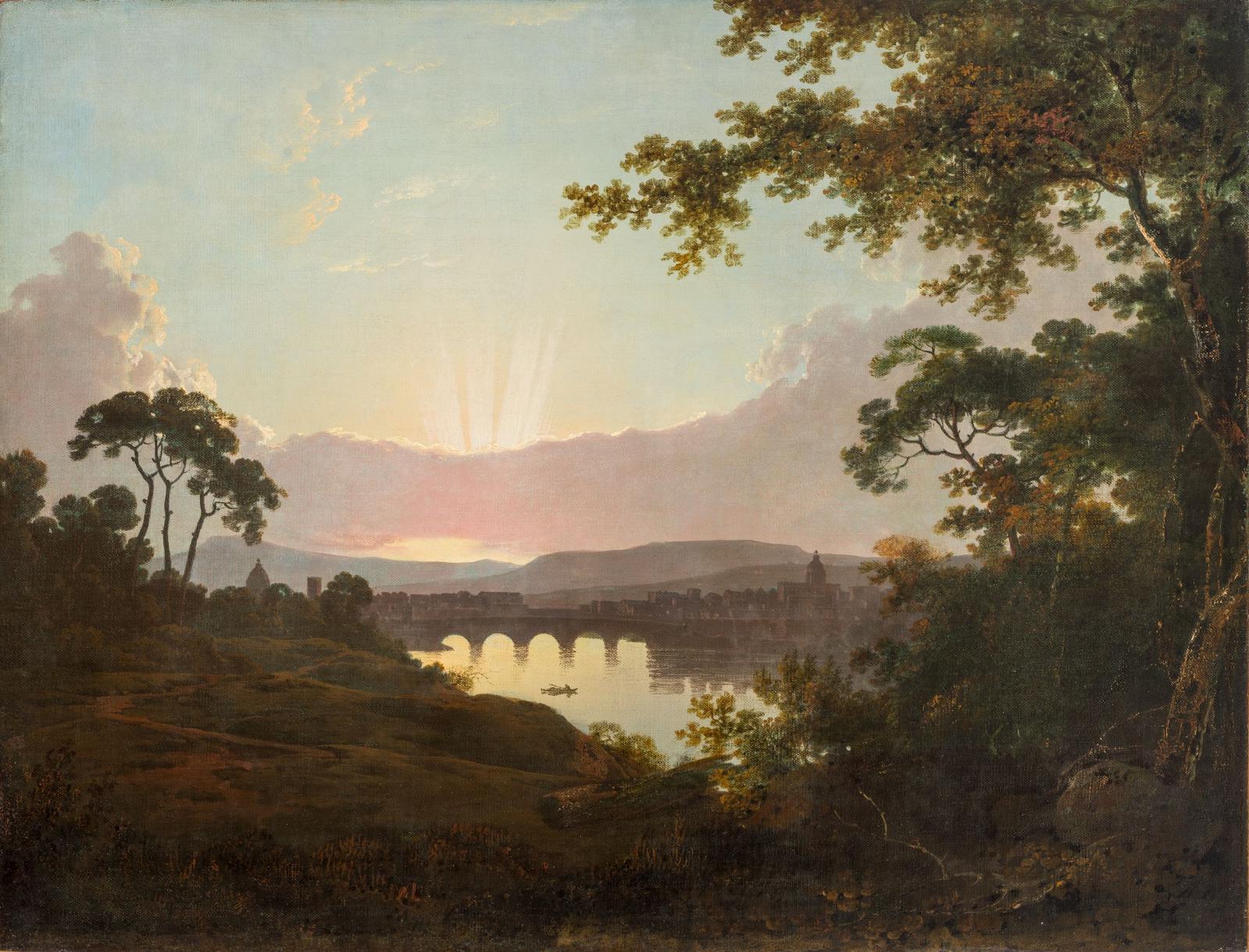 Joseph Wright a passé l’essentiel de sa carrière dans sa ville natale de Derby. Ses débuts, des années 1750 à 1770, sont essentiellement dédiés à l’art du portrait, mais aussi à des scènes de genre originales, présentant dans des ambiances nocturnes au clair-obscur très prononcé des vues de laboratoires d’alchimistes, de forges et de manufactures, faisant de Wright un témoin précoce de la révolution industrielle. Sa célèbre scène du Planétaire (1766, Derby Museum and Art Gallery) ou son Expérience de la pompe à air sur un oiseau (1768, Londres, National Gallery) montrent des sociétés savantes assistant à des démonstrations scientifiques, et, de manière plus générale, les progrès des Lumières par la science. Son séjour en Italie, de 1773 à 1775, renouvelle radicalement sa production jusqu’à sa mort. Sa science de la lumière nourrit un nouvel intérêt pour le paysage, où il privilégie la représentation des sites à l’aube ou au crépuscule. Dans notre Vue de Florence, peinte à la fin de sa vie, près de vingt ans après sa visite de la capitale toscane, Wright choisit un point de vue depuis le parc des Cascine, à l’ouest de la ville, sur la rive nord de l’Arno. Dans la lumière de l’aube, la cité semble s’éveiller face au spectacle grandiose du lever de soleil, caché par les nuages, mais suggéré par de puissants rayons lumineux. Les deux groupes d’arbres, à gauche et à droite, témoignent de son étude attentive de la nature, tandis que les masses de la cité sont représentées dans des formes géométriques simplifiées. L’obscurité générale de la composition permet au peintre de passer subtilement des verts et des bruns aux violets et aux roses, tout en faisant émerger la lumière au centre du tableau, reflétée par l’Arno. De subtils jeux de frottis et des incisions dans la pâte contribuent à faire vibrer la peinture, pour susciter une image où les formes se dissolvent dans une pure impression rétinienne. Cette Vue de Florence ainsi que la Vue du lac de Nemi du musée du Louvre sont les seules peintures de Wright conservées dans les musées français