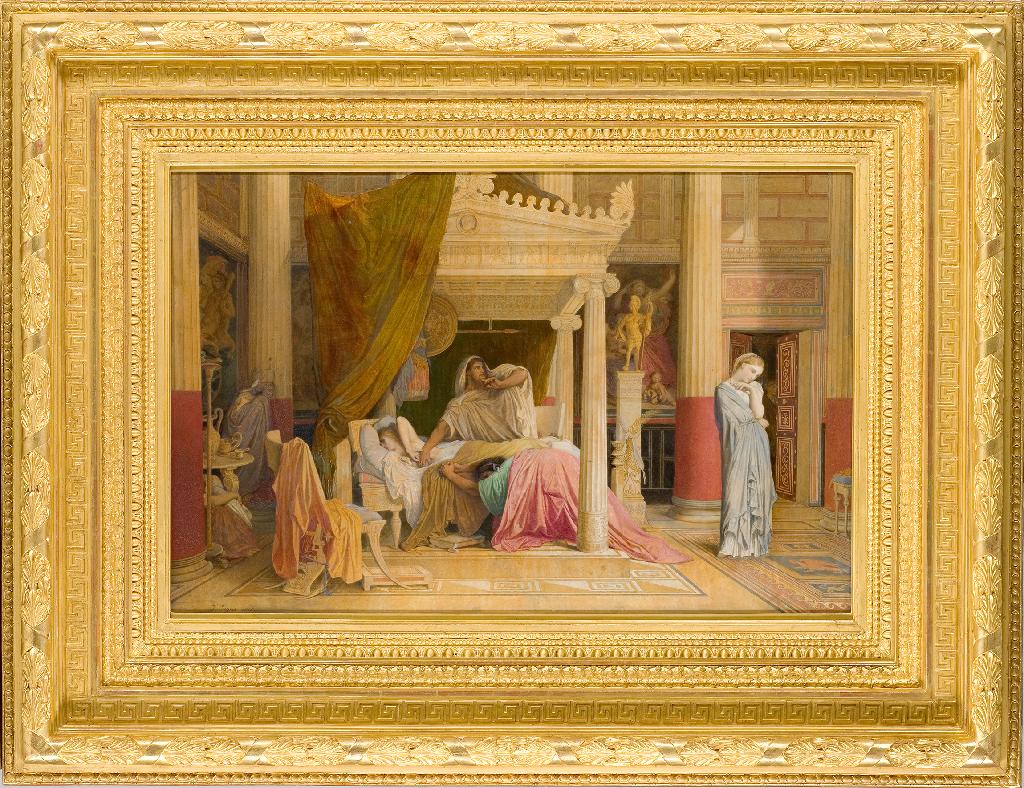 L’histoire d’Antiochus et Stratonice appartient à la geste des Séleucides, dynastie qui régna sur la Syrie et une partie de l’Orient hellénistique au ive siècle avant J.-C. Plutarque raconte dans sa Vie de Démétrius comment le prince Antiochus tombe secrètement amoureux de sa jeune belle-mère, Stratonice. Contraint de cacher cette passion coupable, il dépérit jusqu’à ce que le médecin Érasistrate remarque que les symptômes redoublent à l’apparition de la jeune femme. Ce dernier en informe le roi Séleucos qui, pour sauver son fils, n’hésite pas à se démettre en sa faveur et lui donne sa jeune épouse. Depuis la Stratonice de David (1748-1825) en 1774 (Paris, École nationale supérieure des beaux-arts), le thème est un sujet prisé qui va particulièrement fasciner Ingres. L’origine de cet intérêt vient probablement d’un opéra dû à Étienne Méhul (1763-1817), Stratonice (1792), qui fut au répertoire de l’orchestre du Capitole à Toulouse alors qu’Ingres y tenait un pupitre de violon, de 1794 à 1797. Telle qu’Ingres l’envisage, l’histoire d’Antiochus et Stratonice dépasse l’anecdote moralisatrice stigmatisant les mariages de raison. Ce sont bien les souffrances de l’amour contrarié qu’il met en scène, avec une science consommée de l’art du récit, et un soin méticuleux du détail. Après quelques esquisses en 1801 et 1806 (musée du Louvre), Ingres réalise son premier tableau sur le thème en 1825 (non localisé), puis une version aboutie en 1834 (Cleveland Museum of Art). À peine nommé directeur de l’Académie de France à Rome, il s’appuie sur l’étude minutieuse des vases grecs et des recueils d’archéologie. Chaque élément du mobilier est inspiré de décors antiques : le lit, imité d’un édicule funéraire, symbolise probablement la mort qui frôle le héros. Ce souci de fonder la narration sur des sources archéologiques devient, au fil du temps, une véritable obsession qui explique l’élaboration exceptionnellement longue de la troisième version (Chantilly, musée Condé) : « Cet ouvrage, suscité par quelque mauvais génie, me rend, outre beaucoup de dépenses qu’il m’a coûtées, l’homme le plus malheureux par le temps que j’y consacre », écrit-il en 1837. Achevé en 1840 pour le duc d’Orléans, le tableau, gravé par Réveil en 1851, connaît un très grand succès et apparaît comme le manifeste du style néogrec. Au soir de sa vie, Ingres revient à nouveau sur le thème en 1860 (Philadelphia Museum of Art, avec la présence inusitée d’un lévrier au pied du lit), puis entreprend la version de Montpellier, achevée un an avant sa mort. Ce dernier tableau, dont la composition est inversée par rapport aux précédents, s’appuie non seulement sur un calque portant le relevé de la version de 1840, mais aussi sur un daguerréotype et plusieurs épreuves sur papier (Montauban, musée Ingres). Il semble qu’Ingres ait eu recours à cette technologie balbutiante pour expérimenter de nouveaux effets de lumière, ce qui expliquerait la clarté remarquable de ce tableau, oeuvre de toute une vie.