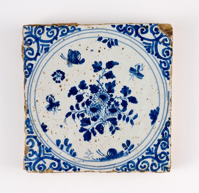Carreau, décor de bouquet centré avec papillon, insectes et escargot, semis de rosettes, motif de ferronneries