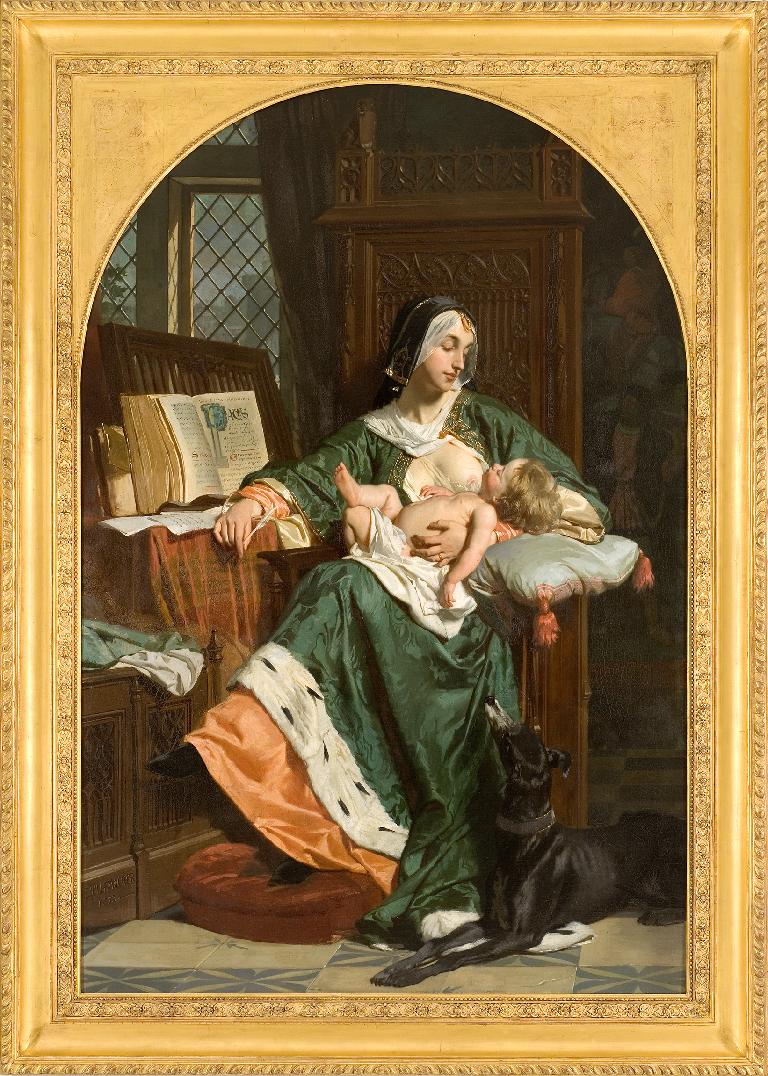 Après avoir étudié à l’École des beaux-arts de Paris dans l’atelier de Léon Cogniet (1794-1880), Hillemacher débute au Salon de 1848 avec une médaille de seconde classe pour Un confessionnal de l’Église Saint-Pierre de Rome, le dimanche de Pâques (Paris, musée d’Orsay) et expose ensuite chaque année au Salon jusqu’à sa mort, obtenant régulièrement des distinctions : médaille de première classe en 1863, rappel de médaille en 1865, Légion d’honneur en 1865. Depuis l’art troubadour, peinture à la fois sentimentale et romantique qui exalte le sentiment du « bon vieux temps », le Moyen Âge reste une des sources d’inspiration favorites des artistes au xixe siècle. Dans ce répertoire se distinguent les anecdotes mettant en scène des personnages féminins exemplaires, comme dans Anne de Boulen condamnée à mort, de Bergeret (1814, musée du Louvre), ou dans Le Supplice de Jane Grey de Delaroche (1834, Londres, National Gallery). Hillemacher s’intéresse particulièrement à ces sujets et traite d’abord la vie de Clotilde de Surville, poétesse du début du xve siècle ; puis il peint Marguerite d’Anjou attaquée par un homme, qu’il présente au Salon de 1866 (musée Fabre). Publiées pour la première fois en 1803, rééditées à plusieurs reprises, les Poésies de Marguerite Éléonore Clotilde de Vallon-Chalys, depuis Mme de Surville, poète français du xve siècle connurent un important succès au xixe siècle. La mystification littéraire fut vite révélée et les textes finalement attribués à Charles Vanderbourg, « découvreur » du manuscrit, et à Joseph Étienne, marquis de Surville, auteur de biographies sur les femmes poètes. Si Hillemacher choisit de représenter la poétesse partagée entre l’écriture et la maternité, c’est que, comme le rappelle A. Nepveu, préfacier de l’édition de 1824, « la réputation de Clotilde est inscrite en lettres de feu dans le coeur de toutes les jeunes mères qui ont lu, ou plutôt retrouvé, ce qu’elles avaient ressenti dans les Verselets à mon premier né ». Les célèbres vers de la prétendue poétesse furent effectivement cités dans le livret du Salon de 1853 : « Ô cher enfantelet, vrai pourtraict de ton père, Dors sur le seyn que ta bouche a pressé ! Dors petiot ! clos, amy, sur le seyn de ta mère Tien doulx oeillet par le somme oppressé. » Hillemacher est à son meilleur dans cet ambitieux tableau où le souci du détail contribue à légitimer l’anecdote. La chevelure du nouveau-né, les étoffes, les accessoires sont l’occasion de démontrer sa virtuosité dans un style raffiné proche de celui de Delaroche (1797-1856) (Les Joies d’une mère, galerie d’art de la Ville de Luxembourg, ou L’Enfance de Pic de la Mirandole, Nantes, musée d’Arts). Ce tableau, présenté au Salon de 1853, fait écho à un autre tableau exposé la même année, Les Baigneuses de Gustave Courbet