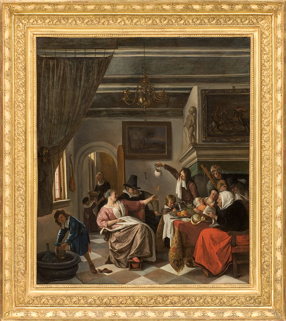 Comme les vieux chantent, les enfants piaillent : nous assistons à une comédie humaine. Après Jacob Jordaens (Anvers, musée royal des Beaux-Arts ; Valenciennes, musée des Beaux-Arts), Steen illustre le vieux proverbe flamand chanté par la vieille femme qui le lit sur le papier qu’elle tient. Il joue sur le mot « piailler » qui, en hollandais, prend le sens de gazouiller comme le jeune oiseau, mais qui est à la racine du verbe jouer de la cornemuse, fumer la pipe et « siffler » un verre. Ici, l’enfant boit à même le pichet, imitant ses aînés adonnés à l’intempérance, en particulier la maîtresse de maison, pourtant garante de l’harmonie et de la pureté du foyer. L’huître, considérée comme un aphrodisiaque, et la pomme, symbole du péché originel, visibles sur la table, ainsi que la statue de l’Amour et le tableau représentant un combat de cavaliers situés sur la cheminée évoquent l’étendue des vices de l’homme qui perdurent à travers les générations. Au centre de l’image, la clef du foyer, accrochée au mur, paraît oubliée par celle qui en a la garde : la maîtresse de maison. Steen a peint plusieurs tableaux différents sur ce sujet, notamment celui du Mauritshuis à La Haye