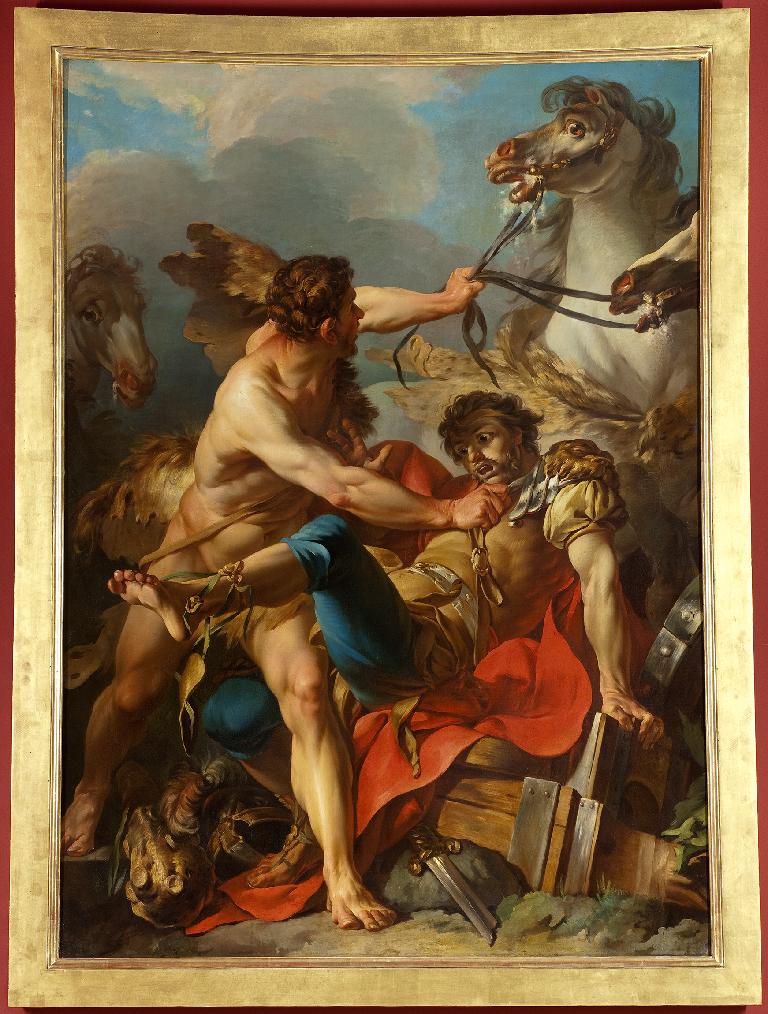 Jean-Baptiste Marie Pierre est une figure décisive du renouvellement artistique dans la seconde moitié du xviiie siècle. Il apporte, dès la décennie 1740, un art nouveau, plein de vigueur et de drame, servi par un pinceau habile aux couleurs franches et affirmées. Indifférent à la hiérarchie des genres, Pierre peint bambochades, scènes de genre et sujets d’histoire avec une étonnante facilité. En décorant les deux coupoles de l’église Saint-Roch à Paris (1752-1757), il renoue avec les grandes réalisations du siècle de Louis XIV. À partir de 1770, il est Premier peintre du roi, directeur de l’Académie royale de peinture et de sculpture et de la manufacture des Gobelins, et se retrouve au coeur de la politique artistique ambitieuse menée par Louis XVI. Pierre n’a que vingt et un ans lorsqu’il remporte le grand prix en 1734, et, après un séjour à Rome de 1735 à 1740, il est reçu à l’Académie sur présentation de ce tableau à l’âge de vingt-neuf ans. La composition illustre la conclusion cruelle du huitième des douze travaux d’Hercule : Diomède, qui donnait des innocents à manger à ses juments anthropophages, est vaincu par le héros qui le punit en lui faisant subir le même sort. Pierre adopte un cadrage délibérément saturé pour valoriser l’intensité du drame, le dynamisme des figures et la puissance des anatomies. Plutôt qu’une composition équilibrée, le peintre choisit de représenter Hercule en raccourci, s’avançant vers le spectateur et dominant de sa force Diomède, renversé de son char, et les chevaux au regard fou et à l’écume abondante. Le peintre mêle à cette dynamique tournoyante et chaotique des allusions savantes à la culture antique : la pose d'Hercule est reprise du fameux Gladiateur Borghèse, qu’il a pu voir à Rome (aujourd’hui au musée du Louvre), tandis que le corps de Diomède est une citation du Torse du Belvédère (musées du Vatican). Pierre peint son tableau en pleine pâte, avec une facilité qui laisse glisser la matière. Les passages d’un ton à l’autre sont assumés par des hachures bien visibles plutôt que par de discrets glacis et renforcent la brutalité de la scène. Par ce tableau, qui le rapproche de Pierre Subleyras et de Joseph Marie Vien, Pierre annonce la fin de l’esthétique suave et nacrée de la rocaille