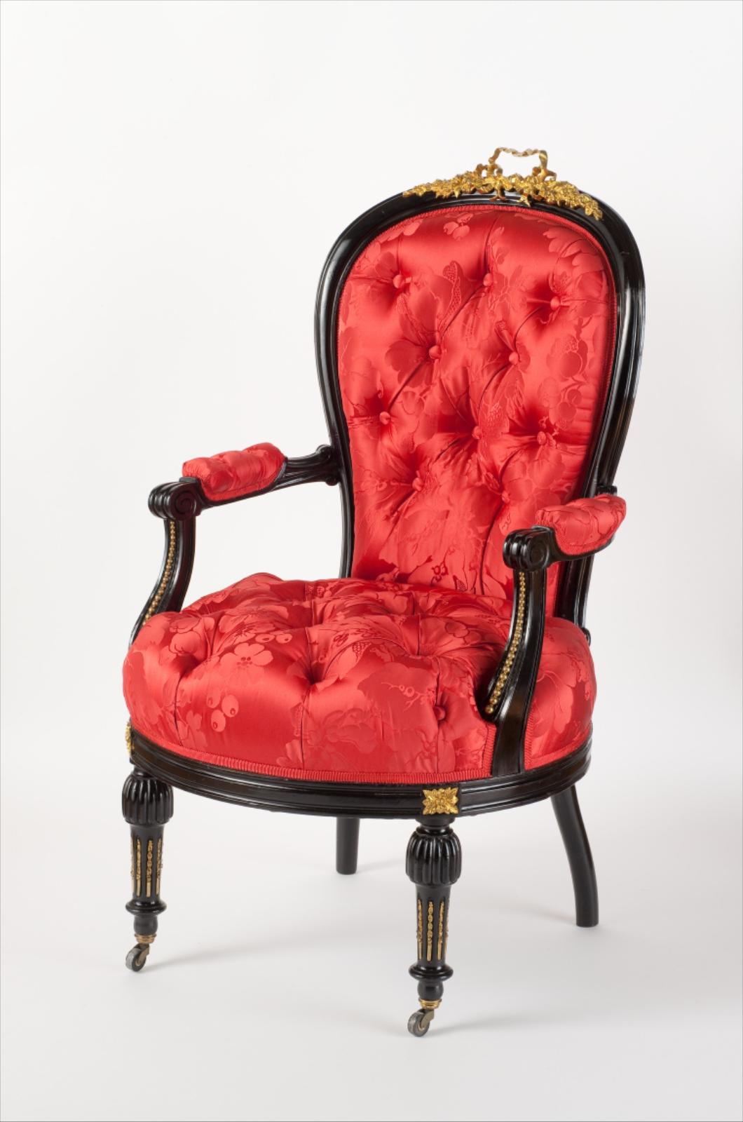 Fauteuil, garniture de damas de soie rouge capitonnée