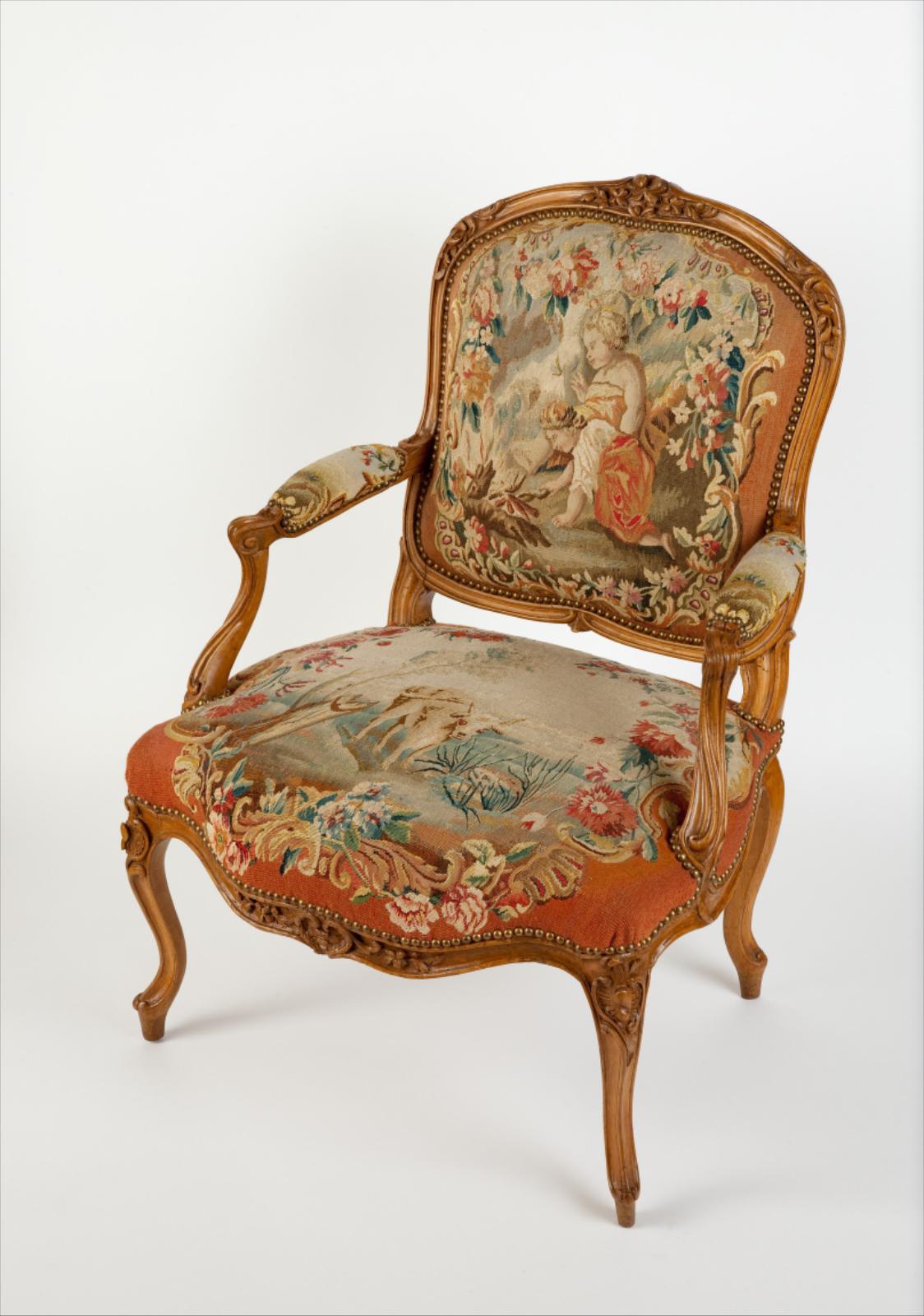 Fauteuil à la reine, garniture de tapisserie aux Fables de La Fontaine "La Grenouille qui veut se faire aussi