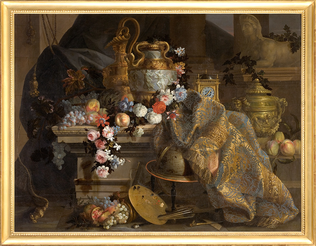 Ce tableau célèbre constitue le morceau de réception de l’artiste à l’Académie royale de peinture et de sculpture le 3 octobre 1665. Il peut être considéré comme l’un des plus beaux exemples de l’art de Monnoyer, mais aussi de toute la nature morte française du Grand Siècle. Avec Monnoyer, la nature morte s’écarte des compositions austères et dépouillées des « peintres de la réalité » de la première moitié du siècle – Lubin Baugin (vers 1612-1663), Louise Moillon (1609/1610-1696), Jacques Linart (1597-1645) – pour retrouver, dans le sillage de Pierre van Boucle, l’abondance et l’opulence de l’art des Flandres. Malgré sa fidélité à la nature, attestée par les auteurs anciens, Monnoyer ne craint pas de juxtaposer ici fleurs de printemps et fruits d’été et d’automne auxquels il adjoint, faisant fi de toute vraisemblance, vase antique, buire, cassolette, sphinge, horloge, mappemonde ainsi que la palette du peintre et ses pinceaux. Au-delà de la profusion décorative, il faut voir dans ce tableau une sorte de portrait symbolique du mécène idéal, faisant preuve d’une curiosité universelle (comme le suggère le globe) et capable d’apprécier avec un goût très sûr les plus belles productions de la nature et les créations les plus raffinées et ingénieuses de l’esprit humain. Le souverain, qui n’est autre que le jeune Louis XIV transfiguré en nouvel Alexandre ou Auguste, ramène une ère de paix et de sagesse politique qui est favorable à la prospérité de la nation et à l’art. Avec un sens inné de l’orchestration décorative apprise aux côtés de Charles Le Brun (1619-1690), peut-être dès Vaux-le-Vicomte, puis aux Gobelins et sur les plus grands chantiers du nouveau règne, Monnoyer unifie sa composition à l’aide de la lourde tenture retenue par des cordons de passementerie et de la cascade majestueuse de la pièce de brocart étincelante d’or. La lumière savamment distribuée exalte les colorations claires et translucides et s’insinue dans les empâtements plus densément nourris. Face au Temps destructeur qui bientôt ensevelira tant de richesse, seule, au pied de l’autel, se dresse la palette du peintre afin de témoigner pour les générations futures des merveilles de ce nouvel âge d’or français.