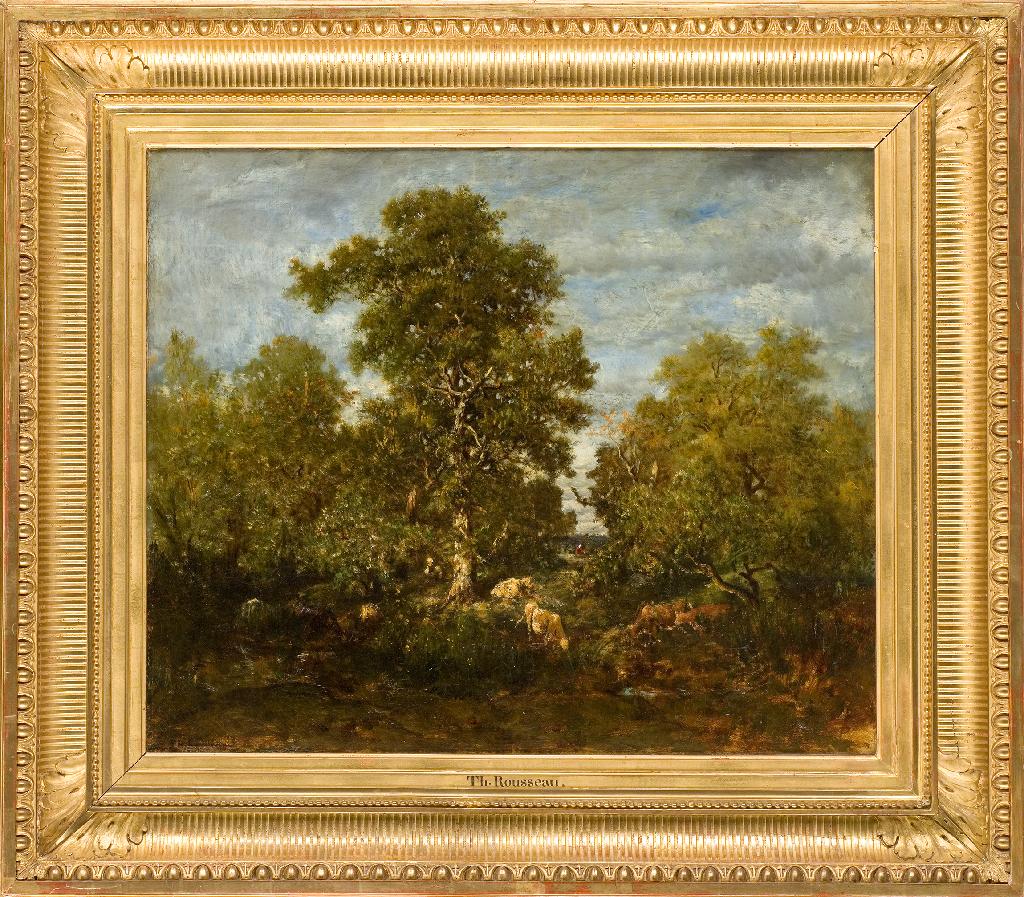 Si le jury du Salon se caractérise au xixe siècle par un aveuglement persistant, un rejet aussi obstiné qu’infondé, c’est bien à l’endroit de Théodore Rousseau : après avoir accepté en 1831, 1833 et 1834 ses premiers envois qui ne prêtaient pas à conséquence, le jury va les refuser systématiquement entre 1836 et 1841, censurant des tableaux essentiels pour l’oeuvre du peintre, La Descente des vaches dans les montagnes du Haut-Jura (1836, La Haye, musée Mesdag), L’Allée des châtaigniers (1839, musée du Louvre). Si ces refus indignent la critique, ils n’en marquent pas moins un coup d’arrêt dans la carrière de Rousseau et le début d’une relation conflictuelle avec l’institution, qui reste définitivement marquée par la suspicion et la rancoeur. L’artiste souffrira au plus haut point de ce manque de reconnaissance et il en mourra, à la suite du rejet de sa promotion à la distinction d’officier de la Légion d’honneur. Son existence fut par ailleurs marquée par des difficultés matérielles récurrentes – dues au peu de commandes publiques qui lui furent octroyées – qu’il dut résoudre par des ventes aux enchères de son fonds d’atelier, aux résultats aléatoires. La première de ces ventes, le 2 mars 1850, est particulièrement surveillée par les amateurs ; plusieurs tableaux figurent aujourd’hui dans les musées nationaux, tel Le Vieux Dormoir du Bas-Bréau (Paris, musée d’Orsay). Le collectionneur montpelliérain Alfred Bruyas, qui s’est installé à Paris depuis quelques mois, s’intéresse à cette école moderne du paysage, dont il partage le goût du vrai. Sans agir directement dans la vente, il achète par un intermédiaire pour la somme de 400 F un des premiers chefs-d’oeuvre de Rousseau, qu’il publie immédiatement dans le catalogue de sa collection en 1851 sous le titre Mare et clairière au printemps – Étude d’arbres dans la forêt de Fontainebleau. Il s’agit probablement du no 37 de la vente, Clairière au printemps, aujourd’hui connu sous le titre de La Mare. La question du titre et de la localisation n’est pas aisée à trancher dans l’oeuvre de Théodore Rousseau. Les mares sont parmi ses sujets de prédilection, pour leur capacité à faire jouer les reflets de la lumière et de l’eau avec les atmosphères incertaines des marais où il aime peindre. Le tableau est généralement daté autour de 1840 ; on trouve à cette époque aussi bien des vues du Berry que de Bourgogne, des Landes ou de Fontainebleau, peuplées de mares et de troupeaux s’abreuvant. Le titre générique actuel permet de s’affranchir de ces questions somme toute accessoires, pour ne retenir que l’essentiel. Comme l’exprime l’artiste lui-même dans une lettre à Théophile Gautier (1811-1872) : « Qu’est-ce que l’art a à faire avec tout cela ? Viendra-t-il jamais d’ailleurs que d’un petit coin ignoré où un homme scrute les mystères de la nature, bien convaincu que la solution qu’il en retire, et qui lui est bienfaisante, l’est aussi pour l’humanité ? »