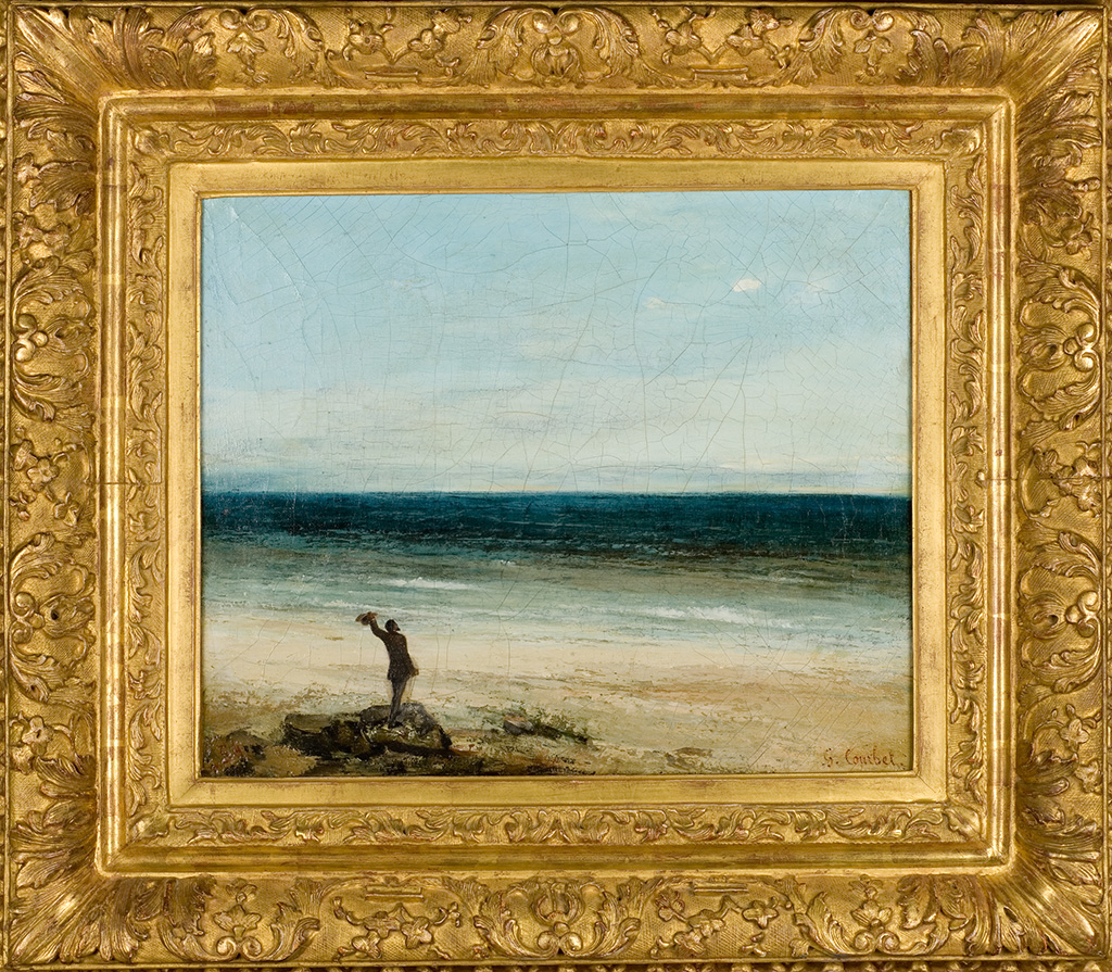 Ce petit chef-d’oeuvre tant de fois reproduit fut exécuté lors du séjour de Courbet en Languedoc de mai à septembre 1854 à l’invitation de Bruyas. Courbet avait déjà vu la mer lors d’un voyage en Normandie en 1841 en compagnie de son camarade Urbain Cuenot. En Languedoc, tournant le dos à la ville qui ne retient pas son attention, il part bien vite excursionner vers la côte et les étangs sur les conseils de Bruyas et de ses amis. Le littoral encore vierge de la Méditerranée, sans cap, sans relief, sans habitations ou presque, plonge sans transition le spectateur dans l’immensité en lui procurant un sentiment d’ivresse et de joie irrépressible. Courbet, habitué aux ruisseaux remplis d’ombres de Franche-Comté, se grise d’air, d’espace et de lumière. Au rebours de La Rencontre où l’échange entre les figures dominait le paysage, cette fois-ci, une frêle silhouette se laisse submerger par les forces de la nature. Elle salue, ébranlée et reconnaissante. Cette petite figure repoussoir au premier plan à gauche donne toute sa force à ce tableau de dimensions modestes qui semble contenir la mer tout entière réduite à trois bandeaux, quasi abstraits, de matière colorée abruptement étalée : ocre pour la plage, vert bleu ultramarin pour l’onde et bleu délavé pour le ciel. Cette rencontre euphorique avec la nature et les mystères du cosmos, Courbet nous la livre telle quelle, sans artifice, dans l’évidence même de la peinture et surtout sans le pathos romantique que l’on trouve chez Caspard David Friedrich dont le Moine au bord de la mer (1809-1810, Berlin, Alte Nationalgalerie) a parfois été rapproché de ce tableau. Cette quête initiatique qui découle du pacte (ou « Solution ») conclu entre artiste et mécène renvoie au second plan la question, souvent discutée, de l’identification du personnage : Courbet ou Bruyas ? Cette marine prélude à toute une série de paysages de mer exécutés par Courbet au cours des années 1860 sur la côte normande dans lesquels la figure humaine tend à disparaître. Whistler s’en inspire en 1865 quand il rencontre Courbet à Trouville (Harmonie en bleu et argent, Boston, Isabella Stewart Gardner Museum).