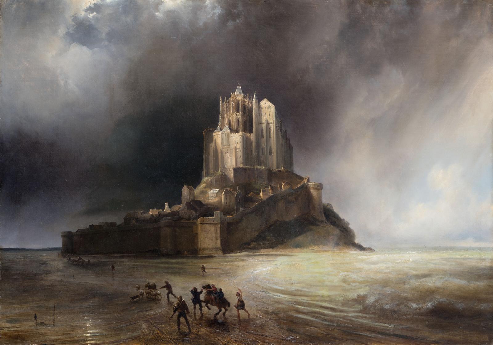Théodore Gudin est un important représentant de la peinture de paysage romantique, spécialisé dans les marines et les vues de port. Après avoir été élève au collège royal de la Marine d’Angoulême, le jeune homme navigue durant trois ans avant de se former à la peinture auprès de Girodet (1767- 1824), de Gros (1771-1835), puis de David (1748-1825) à Bruxelles. Il expose pour la première fois au Salon de 1822, et remporte bientôt des commandes officielles de Charles X, de Louis-Philippe puis de Napoléon III, mais aussi du roi de Prusse ou du tsar de Russie. En 1839, pour le musée de l’Histoire de France au château de Versailles, Louis-Philippe lui commande cent trente-cinq peintures illustrant les grands épisodes de l’histoire de la marine française. Ce tableau a sans doute été peint à la suite du séjour de l’artiste sur les côtes de la Manche et en Bretagne en 1830. De ce voyage demeurent quelques études prises sur le vif du célèbre mont Saint-Michel. D’approche objective, elles diffèrent radicalement de la composition finale, marquée par une dramatisation visionnaire du site, typique du romantisme. Gudin use adroitement des contrastes d’ombre et de lumière, faisant surgir la silhouette de l’abbaye, dont la célèbre flèche de 1899 est encore absente. Une vive lumière dorée, inspirée de la peinture hollandaise du Siècle d’or, tombe sur le chevet de l’abbaye et fait briller les formes gothiques des lancettes et des pinacles de l’église. Le drame est renforcé par le groupe de voyageurs et de bouviers au premier plan, qui semble tout à coup pris entre deux masses d’eau alors que la marée monte. Le peintre, en ajoutant ces figures de petites dimensions, renforce encore la monumentalité de l’abbaye, et joue sur la démesure des échelles, selon le goût du sublime. Ce tableau, tout en contraste, est un formidable témoignage de la sensibilité romantique appliquée au paysage, mêlant la violence et les tourments d’une nature hostile à la silhouette fascinante d’un édifice médiéval célèbre.