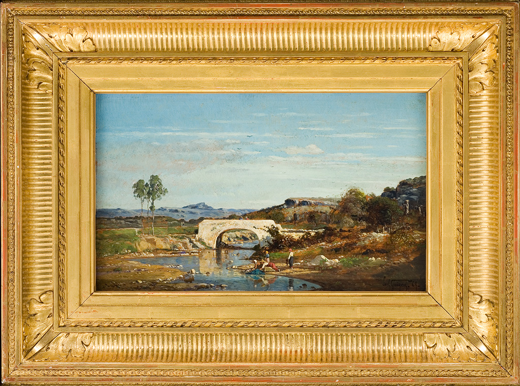 Dernier enfant d’un négociant marseillais, Paul Guigou passe en 1851 un baccalauréat es lettres et entre dans une étude notariale à Apt. Petit à petit s’affirme pourtant chez lui la passion de la peinture : il suit les cours de dessin au collège d’Apt et expose pour la première fois en 1854 à la Société artistique des Bouches-du-Rhône. Établi à Marseille en 1857, Guigou peint sur le motif, en compagnie d’Adolphe Monticelli (1824-1886), fréquente le docteur Gachet et reçoit les conseils d’Émile Loubon (1809-1863). Il renonce définitivement à la carrière notariale en 1861 et s’installe à Paris où le critique Théodore Duret l’introduit auprès du groupe pré-impressionniste au café Guerbois. Même si rien ne vient avérer leur rencontre, il est probable qu’il ait eu des contacts avec son compatriote Paul Cézanne, un autre Méridional exilé à Paris, de cinq ans son cadet. Partageant son temps entre le Midi et la région parisienne, Guigou peint aussi bien à Barbizon dans la forêt de Chailly que sur les bords de la Durance, à Martigues, dans la plaine de la Crau, autour de l’étang de Berre et bien sûr dans la rade de Marseille. Admis chaque année au Salon, il expose également en province, et décède en 1871 sans avoir jamais bénéficié de son vivant d’un achat de l’État ou d’un quelconque musée. Paul Guigou fait partie de la deuxième génération de ces peintres, qui, à la suite d’Émile Loubon, apportent au paysage méridional une nouvelle dimension. Là où ses prédécesseurs ont joué des détails pittoresques du folklore, avec force bergers et troupeaux de chèvres, Paul Guigou se consacre à cette terre aveuglante et sèche, à peine humanisée. Il n’hésite pas à peindre les sites les plus anodins, les terrains vagues, le lit blanchi de la Durance, la terre plate et caillouteuse de la Crau. Trois rochers et une branche à la dérive, un bout de canal, une mare étale, un bouquet de pins au bord d’un chemin vide sont pour Paul Guigou des sujets de tableaux. Il peint comme ici des petits formats sur bois, pratiques à réaliser en extérieur, dans une pâte riche qui semble piéger la lumière. Il excelle à restituer une perspective lointaine par d’infimes ruptures de ligne, multipliant les transitions qui conduisent le regard de la proximité la plus immédiate vers des horizons repoussés au plus lointain. Dans Paysage provençal, les personnages, posés par petits groupes sur trois plans différents, accompagnent le spectateur des rives de l’Arc, près des Milles, jusqu’à la montagne Sainte-Victoire, en empruntant le pont massif, peint comme une roche, et le mince sentier qui file entre trois arbres singuliers et grêles. On reste confondu par cette habileté à varier les échelles, à marier les proches et les lointains, au sein d’une unité totale. Guigou installe le calme et le silence dans sa peinture avec la symétrie parfaite des reflets qui vient boucler sur lui-même le motif principal au coeur de la composition