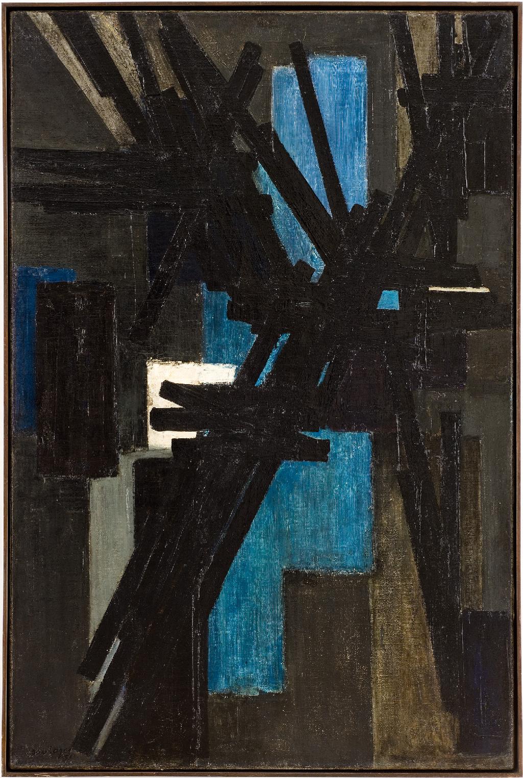 De retour à Paris en 1946 après un bref séjour dans la capitale en 1939, Pierre Soulages s’installe avec son épouse à Courbevoie, puis, fin 1947, dans un appartement comprenant un atelier au 11 bis de la rue Schoelcher, dans le XIVe arrondissement. C’est là que fut réalisée Peinture 146 × 97 cm, 10 janvier 1951, la plus ancienne oeuvre de Pierre Soulages dans les collections du musée Fabre. Celle-ci fut d’abord acquise en 1952 par Alfred Barr, célèbre directeur et fondateur du Museum of Modern Art à New York, grâce à l’intermédiaire du galeriste parisien Louis Carré. L’historien de l’art américain avait été frappé par ce tableau lors de sa présentation au sein de la XXVIe biennale de Venise qui s’était tenue la même année, après qu’il eut été montré lors de la première exposition collective de l’artiste à la galerie de France à Paris, en 1951. Cette oeuvre témoigne des recherches de Pierre Soulages, dès cette époque, sur les effets du clair-obscur, qu’il expérimente au travers de fortes variations de couleurs. Les aplats en bandes verticales bleues et blanches, au centre, contrastent avec les fortes et longues diagonales noires qui forment un réseau noueux dans la partie supérieure de la toile et provoquent, comme le souligne Pierre Encrevé (1939-2019), « la circulation du regard ». L’accord entre le noir et le bleu revient à de nombreuses reprises dans les toiles de Soulages (Peinture 162 × 114 cm, 28 décembre 1959 ; Peinture 55 × 46 cm, 8 janvier 1960 ; Peinture 130 × 349 cm, 16 août 1971, musée Fabre), qui indiquait à Encrevé en 1996 : « Le rapprochement d’un noir et d’un bleu a toujours quelque chose d’assez sensuel, on s’y livre avec une certaine volupté. » Restituée à Pierre Soulages trente-deux ans plus tard par le prestigieux musée américain, qui souhaitait acquérir en échange un grand brou de noix sur toile de 1948, la peinture fut donnée par le peintre au musée Fabre en 2005.