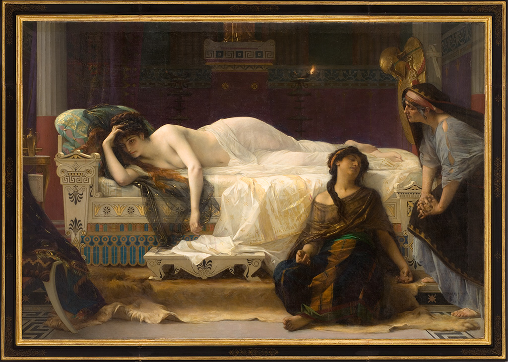 Lorsqu’il présente Phèdre au Salon de 1880, Alexandre Cabanel est un peintre parvenu au sommet de sa carrière, membre de l’Institut, couvert de médailles, doté pour ses portraits d’une clientèle aussi inépuisable que fortunée. L’oeuvre appartient aux grandes compositions théâtrales qui jalonnent sa production, telles la Mort de Francesca da Rimini et Paolo Maltesta (1870, Paris, musée d’Orsay) ou Cléopâtre expérimentant du poison sur les condamnés à mort (1887, Anvers, musées royaux des Beaux-Arts). Cabanel la destine au musée de sa ville natale en souvenir de la bourse qui lui fut octroyée dans sa jeunesse pour poursuivre sa formation à l’École des beaux-arts de Paris. La scène, tirée de la culture classique, nous montre Phèdre mettant au désespoir ses suivantes, après avoir avoué son désir coupable pour Hippolyte, le fils de Thésée son époux. Comme pour décourager toute interprétation abusive, Alexandre Cabanel a pris soin de placer un extrait de la tragédie d’Euripide dans le catalogue du Salon : « Consumée sur un lit de douleur, Phèdre se renferme dans son palais et un voile léger entoure sa tête blonde. Voici le troisième jour que son corps n’a pris aucune nourriture : atteinte d’un mal caché, elle veut mettre fin à sa triste destinée. » Le modèle est probablement l’épouse de l’un des frères Pereire, cette riche famille de banquiers parisiens dont Cabanel fit plusieurs portraits et dont il décora l’hôtel particulier. Le type frêle et fin de la jeune femme évoque également Sarah Bernhardt (1844-1923), qui triomphe alors dans la pièce de Racine à la Comédie-Française. À la demande de l’actrice, Émile Zola (1840-1902) adapte pour elle son roman La Curée sous le titre de Renée (1881). Le personnage central y apparaît comme une Phèdre du Second Empire, évoluant sur fond de spéculation foncière et d’affairisme, affamée de jouissances, jetant son dévolu sur le fils de son époux, Maxime. Zola goûtait fort peu l’art d’Alexandre Cabanel, l’une de ses cibles favorites dans ses comptes rendus du Salon : « Voyez cette misère. Voilà Monsieur Cabanel avec une Phèdre. La peinture en est creuse, comme toujours, d’une tonalité morne où les couleurs vives s’attristent elles-mêmes et tournent à la boue. Quant au sujet, que dire de cette Phèdre sans caractère, qui pourrait être aussi bien Cléopâtre que Didon ? C’est un dessus de pendule quelconque, une femme couchée et qui a l’air fort maussade. » Cependant, on ne peut s’empêcher de penser que l’oeuvre a joué un rôle dans la création de Renée, et que, sous le masque de la tragédie antique, Cabanel livre avec Phèdre une peinture critique de son époque, comme Thomas Couture (1815-1879) l’avait fait en son temps avec Les Romains de la décadence (1847, Paris, musée d’Orsay).