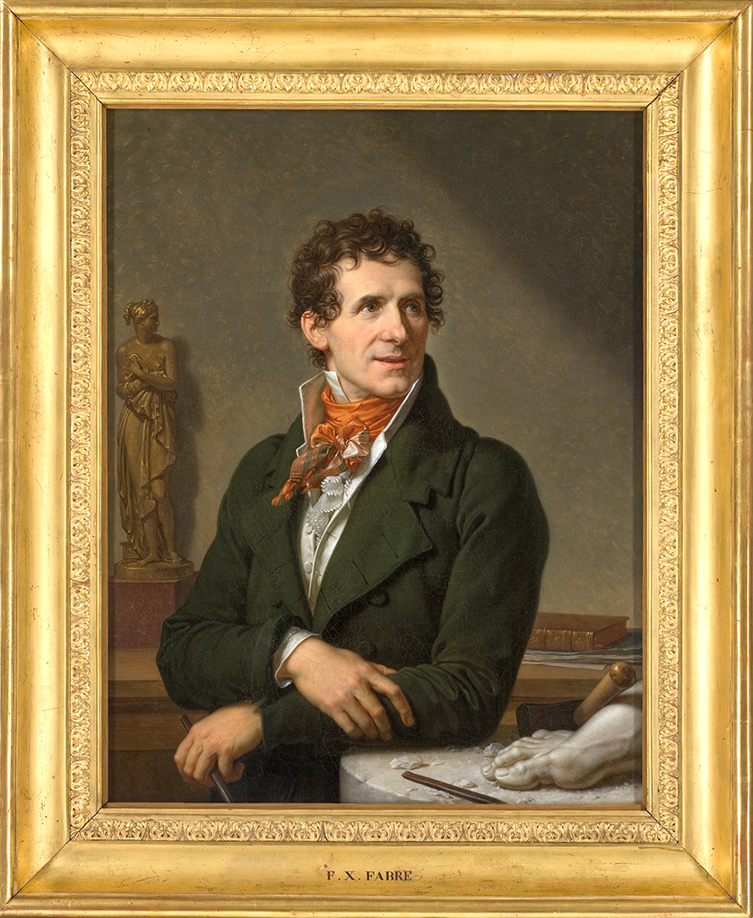 Ce portrait, indéniablement l’un des plus brillants de Fabre, conserve l’image du plus célèbre sculpteur néoclassique que le peintre côtoya en Italie. Après la mort d’Alfieri en 1803, la comtesse d’Albany et Fabre confièrent à Canova le soin d’exécuter le tombeau du poète dans l’église Santa Croce de Florence. En 1811, Fabre et la comtesse visitent l’atelier de Canova à Rome. Au printemps 1812, Canova est à Florence : il vient d’achever la Vénus Italica pour la grande-duchesse de Toscane, Élisa Bacciochi, destinée à remplacer aux Offices la Vénus Medicis « prélevée par les occupants français ». Fabre représente le sculpteur environné des chefs-d’oeuvre en cours : le modello pour la Vénus Italica, qui lui valut une immense renommée, et le pied colossal et nerveux appartenant vraisemblablement à l’Ajax (Venise, palais Treves), qui date de 1812. Fabre, qui a pu étudier son modèle à l’occasion de séances de pose, combine un portrait plein de vivacité et de spiritualité avec une attitude plus calculée. Le fond neutre tout en légers frottis, la masse sombre du buste immobile, les belles mains croisées, le livre et les feuillets marquent l’assurance, l’érudition mais aussi le renom de l’artiste au sommet de son art. L’expression mobile du regard, la bouche entrouverte, les mèches folâtres (en réalité une perruque venant masquer une désavantageuse calvitie), la cravate bouillonnante, les outils et les débris de marbre au premier plan cherchent au contraire à donner l’illusion d’un instantané au moment où l’artiste pose un regard plein de tendresse et de satisfaction sur l’oeuvre accomplie, depuis le registre gracieux de la Vénus jusqu’à la monumentalité de l’Ajax. Un clair-obscur délicat, une exécution à la fois ferme et souple, une science de coloriste qui fait rutiler une cravate rose et orangée au milieu des linges blancs, une élégance et une aisance de bon ton contribuent au charme prenant et inoubliable de la toile. En 1813, Pietro Benvenuti (1769-1844) emprunte le tableau, qu’il compte utiliser pour représenter le sculpteur dans sa composition La Grande-Duchesse Élisa et sa cour, aujourd’hui conservée au musée national du château de Versailles