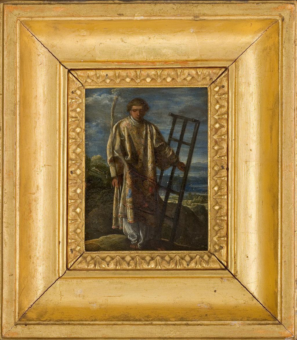 L’Allemand Elsheimer, installé à Rome en 1600, aura une influence importante sur les artistes italiens et nordiques. Peintre d’histoire dont les petites figures sont d’une remarquable efficacité narrative, paysagiste d’une grande sensibilité aux effets lumineux et atmosphériques, il se cantonne aux formats réduits peints sur cuivre. Néanmoins, il sait leur conférer une grande force monumentale dont est exemplaire le tableau du musée Fabre, seule oeuvre d’Elsheimer des musées français. Ce tableau appartient à une série de dix petits cuivres de mêmes dimensions représentant une ou deux figures saintes dans un paysage : huit sont conservés dans la collection Egremont (Petworth House, National Trust : Saint Jean Baptiste ; Saint Jean l’Évangéliste ; Saint Pierre ; Saint Paul ; Saint Thomas d’Aquin ; Tobie et l’Ange ; Sainte Anne et la Vierge ; Saint Joseph et le Christ) ; un Abraham et Isaac n’est plus connu que par la copie qu’en a faite Cornelis van Poelenburch entre 1617 et 1625 (Florence, palais Pitti). Ces peintures ornaient soit un retable de petite taille comme celui de L’Exaltation de la Vraie Croix (Francfort, Städelsches Kunstinstitut), soit un cabinet comme celui appartenant au vicomte de Lisle et Dudley (Penshurst). Peint peu après L’Exaltation de la Vraie Croix (1603- 1605) et achevé en 1605, cet ensemble – et plus particulièrement le Saint Laurent – constitue une étape importante dans l’évolution du paysage chez Elsheimer. En effet, au-delà de la figure isolée au premier plan, monumentale et effleurée par la lumière, un paysage d’une grande ampleur se déploie, très ouvert, sans les traditionnelles coulisses latérales. Le ciel se fond dans l’horizon sans que l’impression d’immensité en soit altérée. La touche miniaturiste suggère aussi bien les reliefs, l’atmosphère, la lumière changeante sur les arbres, les silhouettes d’un voyageur et de son âne que la richesse de la dalmatique du saint sur laquelle Elsheimer a représenté le Christ portant la Croix.