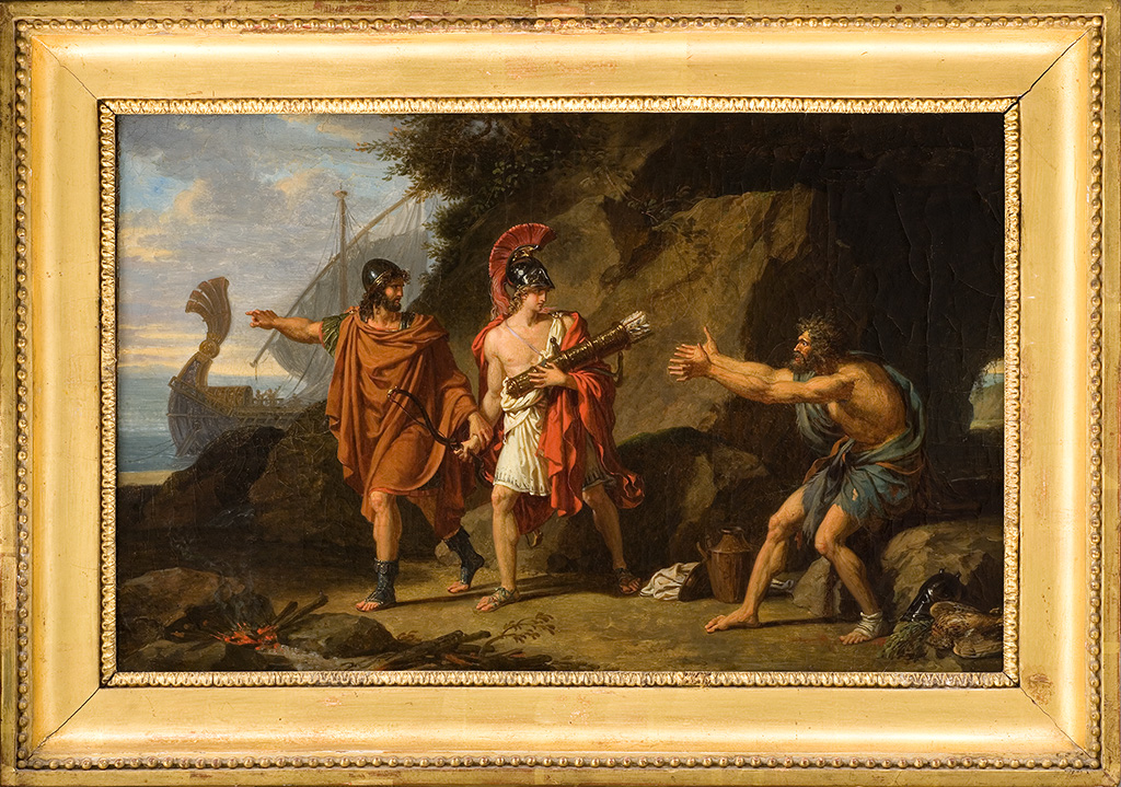 Fabre, formé à Rome pour devenir un grand peintre d’histoire, renoue à Florence avec ses premières ambitions après avoir cédé, un peu par facilité mais aussi par nécessité, à une activité de portraitiste mondain. C’est lord Bristol (1730-1803) qui lui commande fin 1799 un ambitieux tableau qui reste à ce jour la plus vaste entreprise de Fabre dans le domaine de la grande peinture davidienne, tableau déposé par le musée du Louvre au musée Fabre en 2007, après sa restauration. Le sujet, très en vogue (Lethière, Salon de 1799), mettait surtout l’accent sur la destinée tragique du héros solitaire. Fabre, à l’exemple de Valenciennes, préfère le moment de la confrontation des héros à la suite du drame de Sophocle, Philoctète. Le poète Alfieri en avait donné une traduction en vers. Blessé par une flèche pourtant léguée par son ami Hercule, Philoctète est abandonné sur l’île de Lemnos par les guerriers grecs à cause de la puanteur de sa plaie. Pour qu’il soit mis fin à la guerre de Troie, l’oracle réclame les fameuses flèches qu’Ulysse et Néoptolème, le fils d’Achille, sont chargés d’aller récupérer à Lemnos. Ils s’emparent, malgré son refus, des flèches du pauvre Philoctète désespéré, tandis que le jeune Néoptolème semble prêt à s’apitoyer et que l’énergique et intraitable Ulysse est pressé de regagner le navire, près du rivage. Fabre, un peu mal à l’aise dans une vaste composition, choisit de présenter ses figures en frise parallèlement au plan de la toile. Il apporte tous ses soins aux beaux détails naturalistes (armure, rapace mort) qui doivent permettre de donner un souffle de vérité à cette action mythique qui a embrasé l’imagination littéraire du peintre. L’esquisse d’ensemble, brillante et colorée, n’offre que peu de variantes avec l’oeuvre finale, si ce n’est dans la pose de Philoctète, et témoigne du soin accordé par l’artiste à cette commande. La beauté des draperies, le heaume resplendissant, le lourd carquois ciselé forment un contraste saisissant avec la figure solitaire et sauvage du héros abandonné dans son antre ; la scène résume à elle seule les ambitions du peintre d’histoire (rhétorique des passions, clarté de la mise en page, noblesse du sujet) à un moment clé de sa carrière florentine. Délaissant les événements contemporains, Fabre préfère un sujet antique qui invite à une méditation poétique et philosophique sur l’inconstance et l’ingratitude humaines. Le tableau, sans doute dispersé à la mort de lord Bristol en 1803, fut acquis en 1808 par un amateur russe, le comte Miatlev, puis, vers 1814, par Charles Sébastien Scitivaux, ancien payeur général en Toscane, avant de rejoindre les collections royales en 1828.