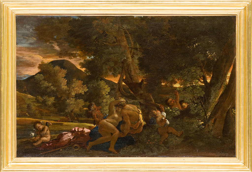 En 1825, Fabre donne au musée un tableau de Poussin intitulé Vénus embrasse Adonis. Longtemps négligé par la critique à cause de prétendues maladresses, le tableau a depuis ces trente dernières années retrouvé une place de choix dans le corpus de l’oeuvre du plus grand peintre français du xviie siècle. Il constitue un précieux témoignage de la première activité de Poussin deux ans après son installation dans la Ville éternelle en 1624. La commande est due à Cassiano dal Pozzo (1588-1657), secrétaire du pape Urbain VIII Barberini, célèbre « antiquaire » romain, soutien infaillible de l’artiste alors en grande difficulté. Poussin se tourne durant ces années (comme la plupart des peintres au même moment) vers la peinture vénitienne et admire les Bacchanales de Titien alors conservées à Rome à la Vigna Aldobrandini. Le thème des amours de Vénus et Adonis, souvent abordé par les peintres à la Renaissance, connaît un regain de faveur avec la publication en 1623 de L’Adone, dédié à Louis XIII, par Giambattista Marino (1569-1625), ami et bienfaiteur de Poussin. L’artiste s’intéresse à ce mythe raconté par Ovide (Métamorphoses, X, 529 et suiv.) tantôt dans son aspect heureux, comme ici, tantôt dans son dénouement tragique comme dans La Mort d’Adonis (musée de Caen). Poussin installe le couple mythique, audacieusement enlacé, à l’ombre d’un massif de végétation, autour duquel s’ébattent des putti joueurs et complices. La déesse de l’Amour semble enjoindre à son amant de ne pas céder à sa passion fatale pour la chasse. En 1978, lors d’une restauration, une inscription sur la toile d’origine a confirmé la provenance Dal Pozzo et a permis de mettre le tableau en relation avec une autre toile de collection privée, Paysage au dieu fleuve. Les toiles réunies correspondent bien à une Vue de Grottaferrata (région des Castelli Romani dominée par le Monte Cavo) commandée par Cassiano dal Pozzo comme dessus-de-porte et coupée en deux parties par ses descendants vers le milieu du xviiie siècle. La partie gauche, classée Trésor national, a pu être acquise par le musée en 2010, avec le soutien de nombreux mécènes. On peut admirer aujourd’hui ce chef-d’oeuvre miraculeusement reconstitué dans toute sa primitive splendeur : à gauche, un dieu fleuve inspiré de statues antiques célèbres (Marforio, Le Tibre et Le Nil du Capitole) donne à boire aux lévriers du chasseur dont on distingue le cor et l’épieu près de la draperie cramoisie, à droite. La largeur d’exécution, la sensualité de la palette colorée, le luminisme ardent, l’extraordinaire palpitation de l’atmosphère procurent au spectateur un sentiment d’ivresse et d’inquiétude mêlées. Ce ciel rougeoyant n’est-il pas annonciateur de l’issue fatale de l’histoire avec la séparation des amants et la mort du héros ?