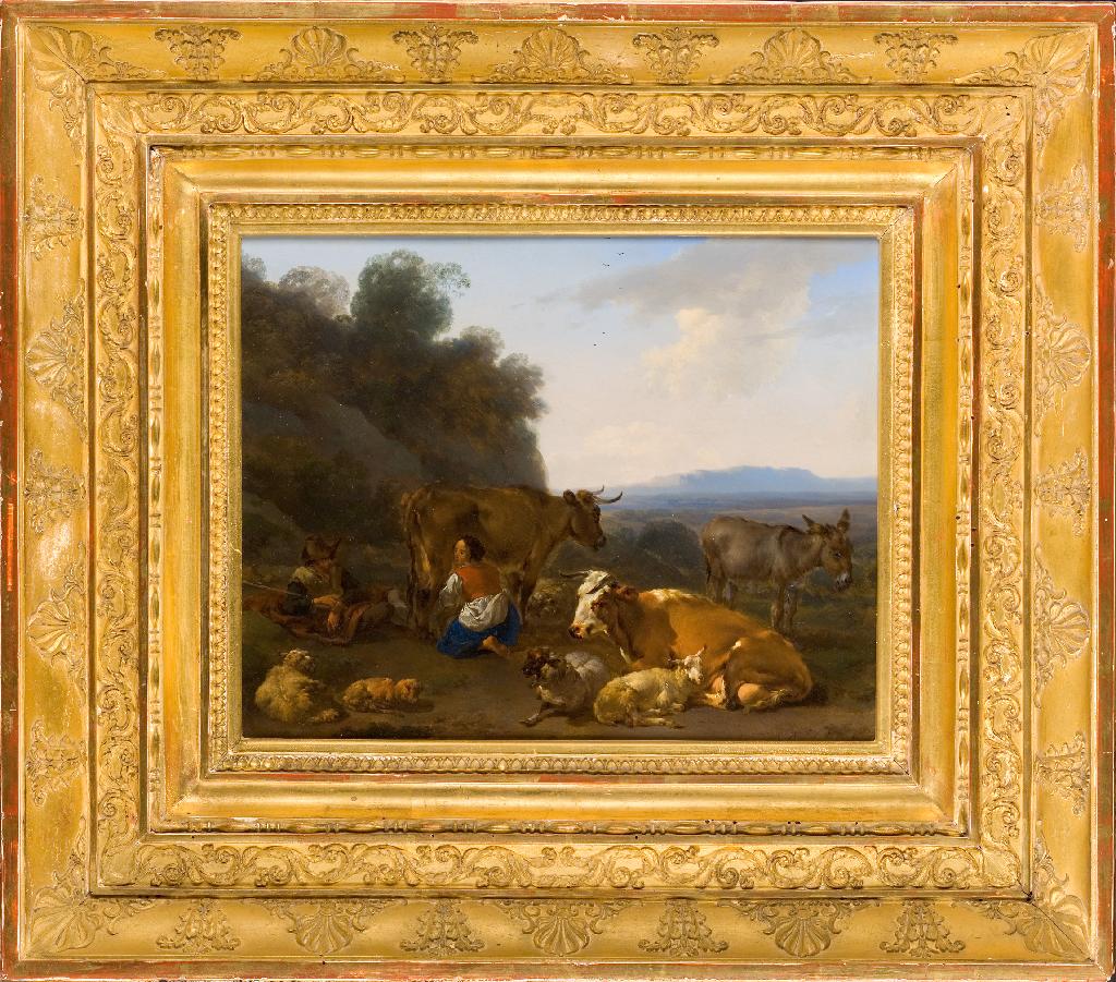 Berchem, qui n’a peut-être jamais voyagé en Italie, s’inspire des scènes et des paysages italianisants de Pieter van Laer (1599-1642), Jan Both (vers 1615/1622- 1652) et Jan Asselijn (vers 1614-1652). Artiste complet, il fait une synthèse très convaincante de l’art de ses prédécesseurs. Berchem place bergers et bêtes au premier plan de paysages d’une grande extension horizontale à l’époque où il peint Les Fagots, dans les années 1670. L’effet de raccourci rapide entre l’avantplan et l’arrière-plan donne beaucoup de volume et de monumentalité aux formes. Ses paysages présentent souvent des reliefs fantastiques – tels les rochers étranges inspirés des sites de la Campanie. La lumière chaude et enveloppante du Sud, répandue par les teintes claires et transparentes, produit un éclat intense et naturel. Bien avant les paysagistes du temps de Valenciennes et de Corot, les Nordiques italianisants ont su voir et rendre la lumière italienne. Un dessin préparatoire à la plume conservé à Bruxelles (musées royaux des Beaux-Arts) est composé de manière plus touffue : dans le tableau, Berchem obtient plus de clarté et d’efficacité. La pastorale Bergers et troupeau de 1677, peinte sur cuivre – un support peu fréquent chez l’artiste –, privilégie une lumière froide du matin, avec un effet de contre-jour sur les buissons qui évoque son aîné, Cornelis van Poelenburch (vers 1594-1667).