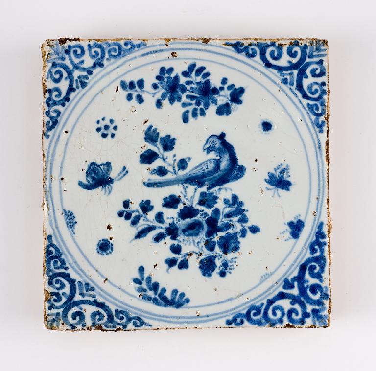 Carreau de revêtement, oiseau posé et papillons dans un semis de fleurs