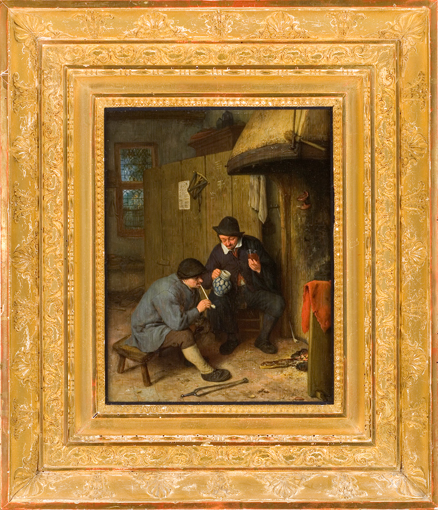 Peintre de genre d’une grande longévité, Van Ostade a beaucoup évolué : sa manière des années 1630-1640, inspirée des truculences du Flamand Adriaen Brouwer (vers 1605/1606-1638), fait sien le clair-obscur de Rembrandt pour en tirer des effets de lumière étranges et presque inquiétants ; après 1640, le climat de ses scènes populaires s’apaise puis, après 1660, il privilégie un coloris clair, une lumière égale, une facture lisse et fine, très détaillée, qui cherche certainement à suivre la mode des fijnschilders (peintres fins) de Leyde, comme Gerrit Dou : c’est à ce dernier style que notre tableau de 1666 appartient. À l’instar du Flamand David Teniers le Jeune, Van Ostade maîtrise une harmonie colorée à base de bruns et de gris, de bleus et de mauves, exaltée de discrètes taches rouges. Nouvelle parenté avec le très admiré Teniers, sa peinture des moeurs populaires est pleine d’empathie et heureuse, charmée de montrer des paysans paisibles, même un peu endormis par les effets narcotiques du tabac et du vin : on conçoit difficilement cette scène comme une caricature de moeurs dépravées ou comme une injonction à la tempérance, significations en filigrane de maintes scènes de genre du début du siècle, telles d’ailleurs les premières « gueuseries » de Van Ostade. Si les traits et les chiffres à la craie récapitulent probablement les consommations des clients, certains détails – le dévidoir, le chapelet – font penser que ces paysans sont dans une auberge familiale, domestique. La bonhomie rustaude des corps épais de ces paysans tente de retrouver l’humanité « abstraite », générale des figures monumentales de Pieter Bruegel l’Ancien (vers 1525-1569), modèle finalement constant de Van Ostade.