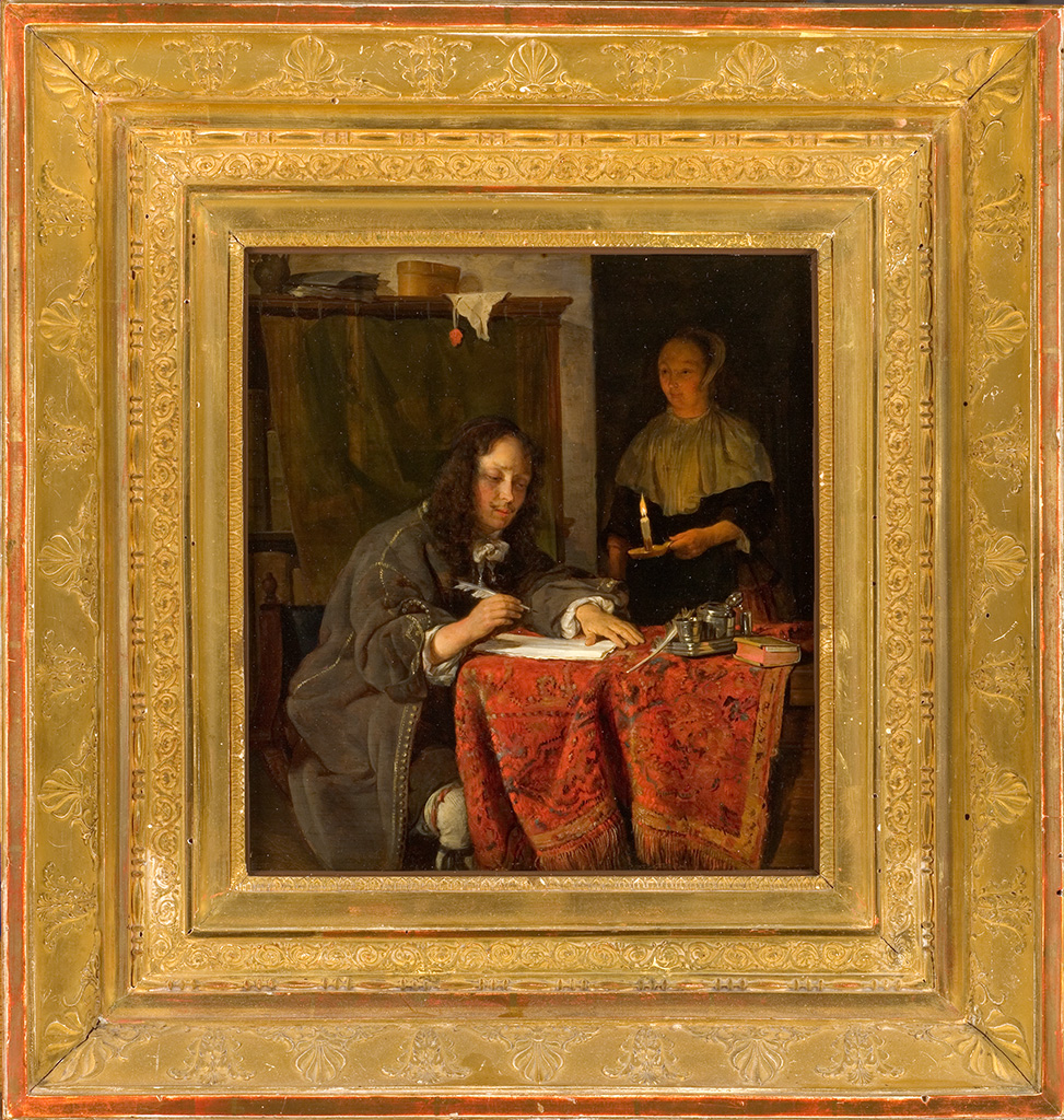 Le Jeune homme écrivant, datable vers 1658-1660, possède un pendant au Timken Museum of Art, à San Diego : une Jeune femme recevant une lettre. Leurs sujets témoignent de la mode d’origine française pour l’art d’écrire, calligraphier et composer une lettre : Gerard ter Borch (1617-1681), puis Frans van Mieris et bien sûr Johannes Vermeer (1632-1675) ont exploité cette veine mondaine. Metsu s’est représenté dans ce jeune écrivain, et sa jeune épouse Isabelle de Wolff est peut-être celle qui reçoit le courrier (portraits conservés à Louisville, J. B. Speed Museum). Metsu peint dans une facture souple et moelleuse, très virtuose, qui traite les formes par plans larges. L’éclairage de la chandelle inspiré certainement par les nocturnes de Dou, le maître de Leyde, ville natale de Metsu, crée une aura d’intimité à cette scène resserrée sur quelques personnages comme chez Ter Borch