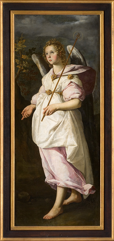L’Ange Gabriel provient, comme son pendant Saint André (Budapest, Szépmuvészeti Múzeum), du collège dominicain de Santo Tomás de Séville. Généralement associé à la scène de l’Annonciation, l’archange Gabriel apparaît rarement de façon isolée et en pied. C’est d’ailleurs le seul exemple connu chez Zurbarán. Gabriel est représenté ici dans l’attitude de la marche et offre un aspect juvénile, peut-être inspiré par les enfants de choeur lors des processions du Corpus Christi à Séville. Il tient de la main gauche un long sceptre (insigne des hérauts) terminé par une croix dans un nimbe lumineux, sur laquelle figurent le monogramme M de Marie et les premières lettres AV (ave) de la salutation au moment de l’Annonciation. Réalisme et maniérisme précieux se conjuguent ici pour créer une image d’un raffinement poétique inoubliable : sur l’enveloppe ténébreuse du fond se détache le visage poupin et extasié de l’ange à la chevelure dorée et ciselée, qui fait écho aux ornements et au feuillage à gauche. Il impose d’emblée sa présence surnaturelle. Le modelé ferme et vigoureux des membres crée un savoureux contraste avec les étoffes bouillonnantes enlevées dans une pâte nourrie aux infinies nuances de blanc, de mauve et de rose. Cet enfant de lumière rempli d’une modeste assurance, sans doute réalisé vers 1631-1632, formait à l’origine un contraste saisissant avec le vieil apôtre à la rusticité interrogative qui lui faisait pendant