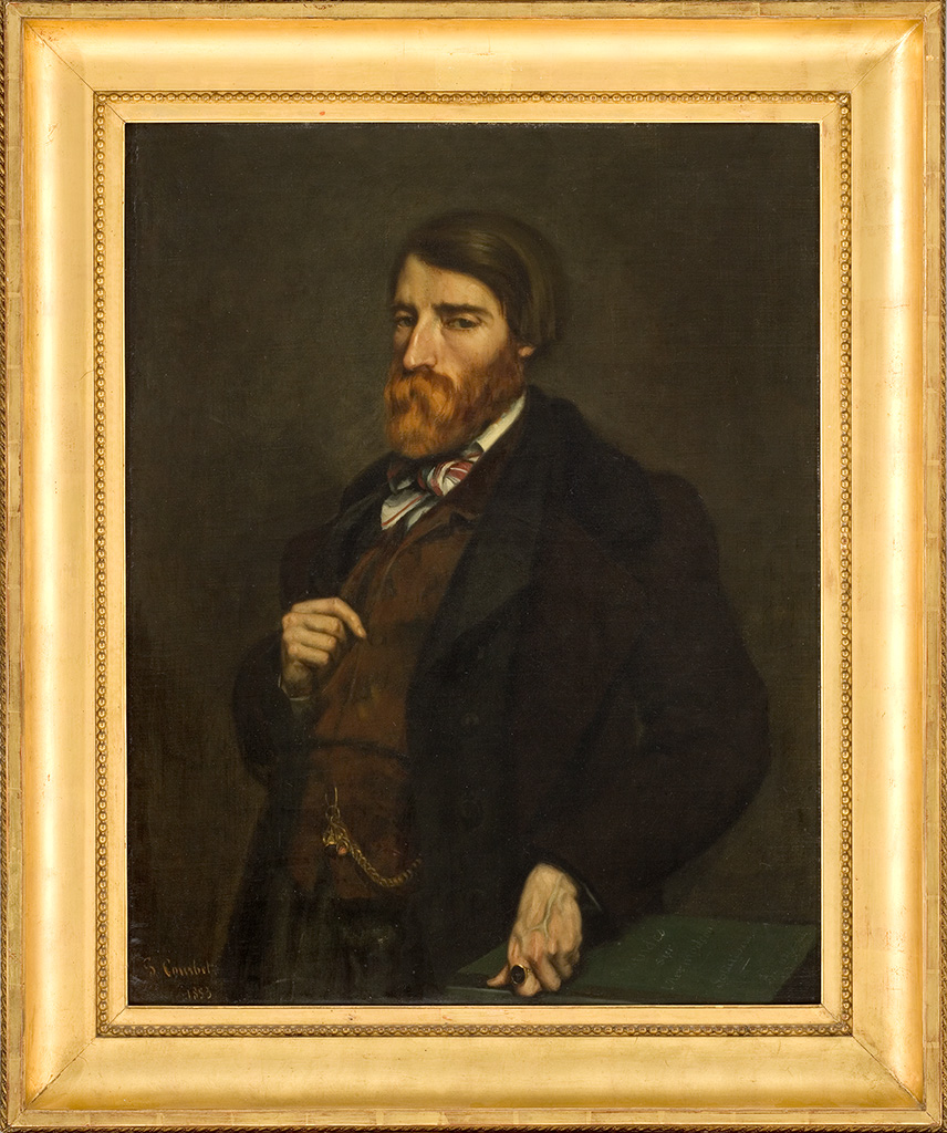 C’est très peu de temps après l’achat par Bruyas des Baigneuses et de La Fileuse endormie au Salon de 1853 que Courbet réalise ce premier portrait de celui qui va devenir son principal mécène : le 13 mai, le peintre rapporte à ses parents qu’une offre de 2 000 francs a été faite pour La Fileuse ; le 18 juin, un message à Alfred Bruyas nous révèle que les séances de pose ont commencé. L’image que Courbet va produire du jeune collectionneur est bien différente de celles que ses prédécesseurs ont laissées. Le dandy, le flamboyant, l’introverti, le maladif a fait place à un homme dans la force de l’âge, fermement campé dans ses certitudes, décidé à mener son combat. L’acquisition des tableaux scandaleux de Courbet a changé le jeune homme ; dans ses écrits, le mot « sérieux » revient avec insistance. Le moment est venu où les principes se traduisent en actes. Le poing gauche fermement appuyé nous désigne un gros volume à la couverture cartonnée portant le titre Étude sur l’art moderne – Solution. Fait rarissime pour un particulier, Bruyas publie chaque année depuis 1851 un catalogue de sa collection dont le volume et l’ambition ne cessent d’augmenter. Il ne s’agit plus désormais de dresser la liste des tableaux composant sa galerie, mais d’exprimer une vision – parfois confuse – sur les fins et les moyens de l’art de son temps, comme sur sa destination sociale et politique. Le mot « solution » n’est pas neuf ; emprunté au vocabulaire fouriériste, il désigne la réponse à apporter à la question sociale, interrogation qui préoccupe tout réformateur en ces temps d’utopie. En 1852, Bruyas associe au terme « solution » la peinture misérabiliste d’un Tassaert ; en 1853, la solution suppose une sincérité de la vision, fondée sur l’étude du réel, comme chez Corot, Troyon, et Couture. En 1854, pour le collectionneur, le champion a changé : le mot solution est appliqué aux Baigneuses de Courbet et le nouveau portrait de Bruyas, titré Tableau-Solution, est dédié au progrès. La « cordée » Bruyas-Courbet est désormais formée. Grâce à l’argent de Bruyas, le peintre, délivré du souci du quotidien, de son cortège de compromissions, peut avancer dans la voie d’un art libre ; grâce au talent de Courbet, le mécène, ayant trouvé un héraut à la mesure de ses ambitions, peut soutenir un art vrai, et rétablir la concorde et la paix. Faut-il imaginer qu’en quelques semaines à peine les deux hommes aient acquis la complicité intellectuelle que suppose le Tableau-Solution ? Bruyas manifestait un intérêt certain pour Courbet depuis 1852, année où une Tête d’étude (non identifiée) apparaît dans sa collection. Nous pouvons supposer que ces premiers contacts ont pu précéder l’exécution du tableau, qui apparaît comme un pacte, scellé en juin 1853 pour faire triompher une vision réconciliée de l’art et de la société