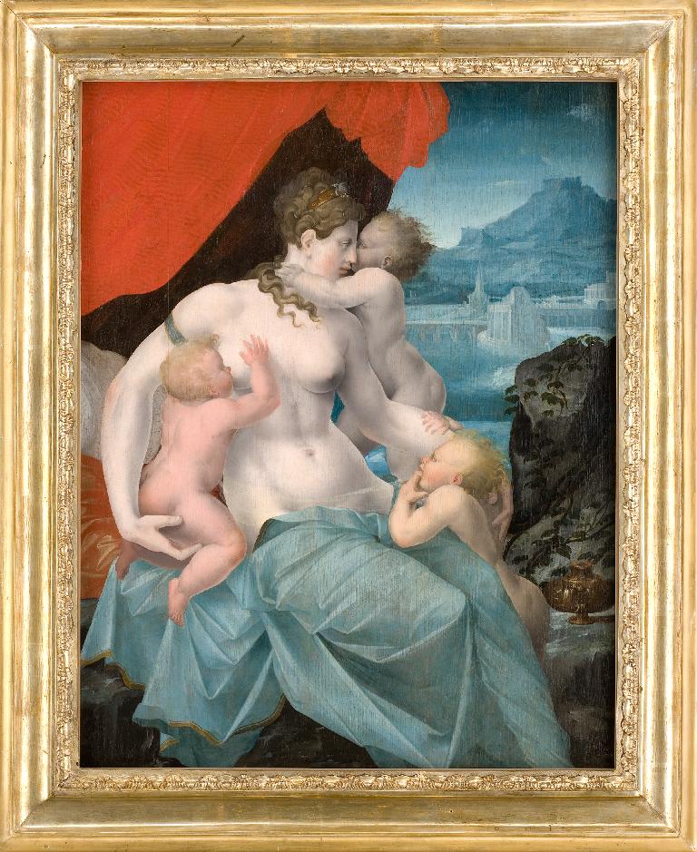Ce panneau est une pièce très importante de la peinture française du xvie siècle, période mal connue dont subsistent surtout des peintures murales, comme celles de Rosso Fiorentino (1494- 1540) et de Francesco Primatice (1504-1570) au château de Fontainebleau et de Noël Jallier (actif vers 1550) au château d’Oiron. La Charité de 1518 d’Andrea del Sarto (1486-1530), peinte pour François Ier, est à l’origine de la divulgation en France de l’iconographie italienne de la vertu chrétienne de la charité qui symbolise l’amour de Dieu et l’amour du prochain : une femme qui accueille, allaite et réchauffe trois enfants. Charles Sterling attribua en 1955 à Jean Cousin le Père La Charité de Montpellier auparavant donnée à l’école de Primatice puis à celle de Rosso. Mal connu, on sait qu’il fit des cartons pour des tapisseries (Vie de saint Mammès, 1544, musée du Louvre et cathédrale de Langres), pour des vitraux, des décors éphémères pour l’entrée d’Henri II à Paris ; une seule peinture lui est attribuée avec certitude, l’Eva, prima Pandora (vers 1549-1550) du musée Louvre. L’opinion de Sterling est fondée sur la ressemblance des figures féminines des tableaux du Louvre et de Montpellier inspirées des nus antiquisants peints en France par Rosso et Primatice à Fontainebleau, ainsi que sur la similarité entre les plis aigus de La Charité et ceux des drapés dans les cartons de la Vie de saint Mammès. Le coloris acide appartient au monde maniériste de Fontainebleau. Il est très probable que la composition de Cousin soit inspirée directement d’un stuc de Rosso de la galerie François Ier, représentant une Charité romaine, ou d’après la gravure de 1542 qui la reproduit presque fidèlement, attribuée à Giulio Bonasone (actif à Rome et Bologne entre 1531 et 1576) : la figure féminine est nue dans une position bien proche (en dernière instance, un modèle romain antique, le bas-relief de Tellus de l’Ara Pacis à Rome, est peut-être à l’origine de toutes ces oeuvres). Les cheveux emportés par le vent, motif emprunté à Rosso, donnent du dynamisme à l’élan des enfants. Très stylisé, ce tableau aux contours très linéaires est d’une rigueur de composition qui simplifie les plans et les formes, d’une monumentalité modulée par les lignes légères sur le rideau rouge, les ombres rares et transparentes qui donnent du volume aux corps