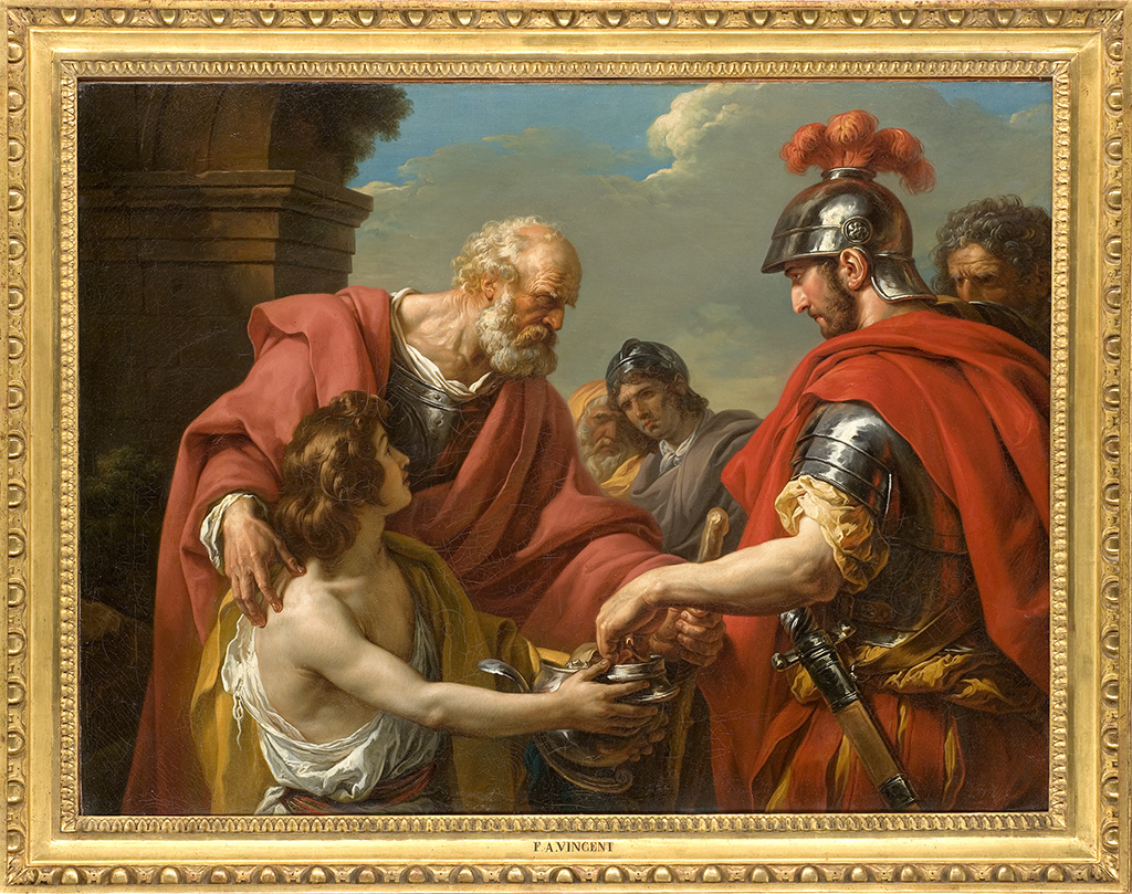 Alors qu’il rentrait de Rome, nouvellement agréé par l’Académie, Vincent montra à l’occasion de sa première participation au Salon en 1777 toute l’étendue de son talent. Parmi les quinze toiles aux sujets variés qu’il exposa, le jeune artiste traitait avec le Bélisaire et son pendant Alcibiade et Socrate deux épisodes de l’histoire antique vantant la morale et l’exemplarité des Anciens. Bélisaire, rendu célèbre par le roman de Marmontel, publié en 1767, était le général en chef des armées de Justinien. Victorieux des Vandales et des Ostrogoths, il fut victime d’un complot et disgracié par l’empereur. Condamné à errer, aveugle, mendiant pour sa subsistance, il est reconnu par un de ses anciens soldats. Traité par Jollain en 1767 (marché de l’art), Durameau en 1775 (Montauban, musée Ingres- Bourdelle), Peyron en 1779 (Toulouse, musée des Augustins) et surtout David en 1781 (Lille, Palais des Beaux-Arts), le sujet séduisit de multiples artistes car il évoquait tout à la fois les revers de la fortune et, malgré les épreuves, la permanence des vertus du héros. Bélisaire s’avance humble et sans honte, accompagné d’un enfant qui recueille les aumônes dans un casque, symbole de sa gloire passée, alors que son lieutenant le regarde, à la fois incrédule et honteux. Sur le visage des autres protagonistes se lisent l’indignation et le remords. Alcibiade est quant à lui passé à la postérité comme l’un des principaux interlocuteurs de Socrate ; intervenant dans Le Banquet de Platon et dans deux dialogues qui portent son nom, cet homme d’État grec était connu autant pour sa beauté que pour sa vanité. Il est représenté ici recevant les leçons du philosophe, dans un contraste où la grâce du beau jeune homme s’oppose à la laideur du penseur, puissant pédagogue et esprit éclairé par son génie. Ces deux tableaux sont traités dans un cadre serré, les personnages sont saisis à mi-corps dans une composition rappelant Caravage ; les notations de décor sont absentes et seuls le contraste des costumes, l’échange des regards, le jeu des gestes donnent leur tension dramatique aux deux scènes. S’écartant ainsi d’une vision grandiloquente de la peinture d’histoire, Vincent incarnait le renouveau qui se jouait alors dans l’art et devenait l’un des chefs de file du néoclassicisme.