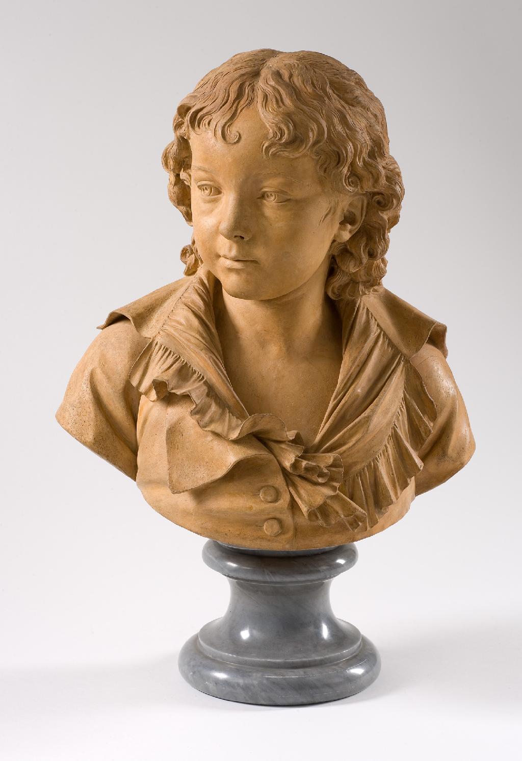 C'est lors de son séjour montpelliérain durant la Terreur (1792-1794) que Pajou modela ces deux bustes d'enfants. Le buste de la jeune fille était entré au musée Fabre grâce au legs de Mme Renée de Cabrières, épouse de Frédéric Sabatier d’Espeyran. Cette importante collection abritait en effet plusieurs oeuvres de Pajou, notamment le Buste de madame Allut, fille d’une famille de parfumeurs locaux, et celui d’un homme inconnu qui venaient compléter le buste du Conventionnel Beauvais de Préau (1745-1794), présent dans les collections depuis la Révolution. Ce groupe était encore enrichi par l’acquisition du buste du jeune Paulin des Hours en 1978, puis, plus récemment, celui de Jean-Baptiste Riban. Les premiers contacts de Pajou avec la capitale languedocienne remontaient à 1784, à la suite de la commande d’un groupe sculpté pour la place royale du Peyrou. Fuyant la tourmente révolutionnaire et cherchant un climat propice à son épouse malade, Pajou se réfugie à Montpellier en 1792, accueilli par Maurice Riban (1721-1805), père de Jean-Baptiste, parfumeur et membre fondateur de la Société des beaux-arts, dont il modela également un buste en terre (Vizille, musée de la Révolution française). L’hospitalité bienveillante de cet amateur offrit un havre paisible à l’artiste, qui réalisa pendant cette période de nombreux portraits sculptés des notables montpelliérains. Issu d’une famille de propriétaires terriens de l’Hérault, François Farel adopta son neveu Paulin des Hours dont il fit son héritier. Outre cette terre cuite, le jeune garçon est connu par un tableau contemporain réalisé par Antoine Jean Gros (1771- 1835) (Rennes, musée des Beaux-Arts). La proximité stylistique entretenue avec le Buste de jeune fille semble indiquer deux pendants et a longtemps laissé croire que l'effigie féminine représentait une soeur de Paulin. L’étude généalogique n’a cependant pas permis à ce jour de l’identifier clairement, bien que l'inscription sur le piédouche atteste de son origine montpelliéraine. Avec une réelle empathie pour ses modèles, c’est une vision de l’enfance sensible et pleine de tendresse que nous donne Pajou. Si l’expression des visages est un peu figée, l’arrondi poupin de la tête du garçonnet, transcrite avec justesse, contraste avec le traitement plus affiné du profil féminin. Une élégante arabesque ouvre le col de Paulin alors qu’un fin plissé dégage la gorge de la jeune fille ; les fines boucles de leurs chevelures s’épanouissent sur leurs épaules en une savante cascade qui contribue au sentiment de fraîcheur de ces portraits. Fidèle à l’esprit du XVIIIe siècle et aux théories rousseauistes, Pajou nous donne à voir la vision idéalisée d’une enfance insouciante et heureuse que le monde des adultes n’a pas encore pervertie. L’expression de Jean-Baptiste Riban est plus ferme et résolue, les sourcils froncés et la bouche esquissant un sourire spirituel. Cet amateur d’art, qui fréquenta avec passion les réunions de la Société des beaux-arts de Montpellier aux côtés de son père Maurice, est représenté dans un costume élégant, la chemise largement ouverte. Les multiples revers du col offrent une dynamique particulière à l’effigie, de même que les ondulations de la perruque, qui donnent du rythme et du relief. Ce bel ensemble sculpté atteste de la fécondité du séjour montpelliérain de Pajou comme du goût de l’élite sociale montpelliéraine, soucieuse de se voir immortalisée dans d’élégants bustes pleins de vie.