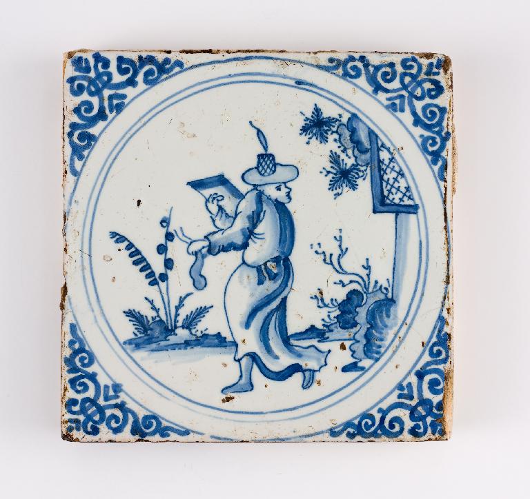 Carreau de revêtement, Chinois lettré marchant tablette et petit sac à la main, paysage chinois