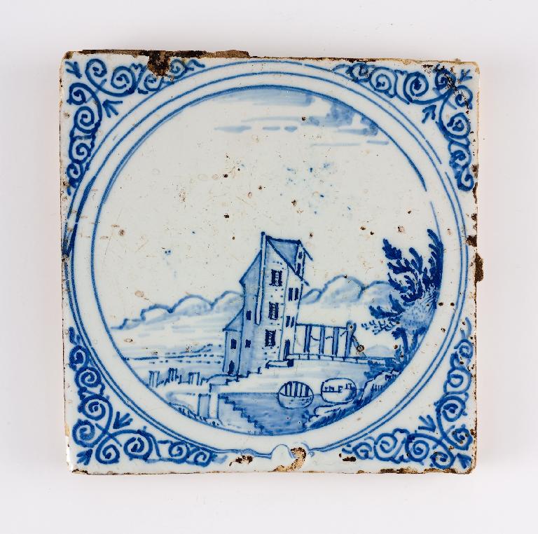 Carreau de revêtement, fabrique, moulin (?) au bord de l'eau, paysage de collines