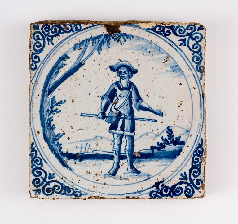 Carreau de revêtement, homme au bâton et à la gibecière, paysage de collines et arbre