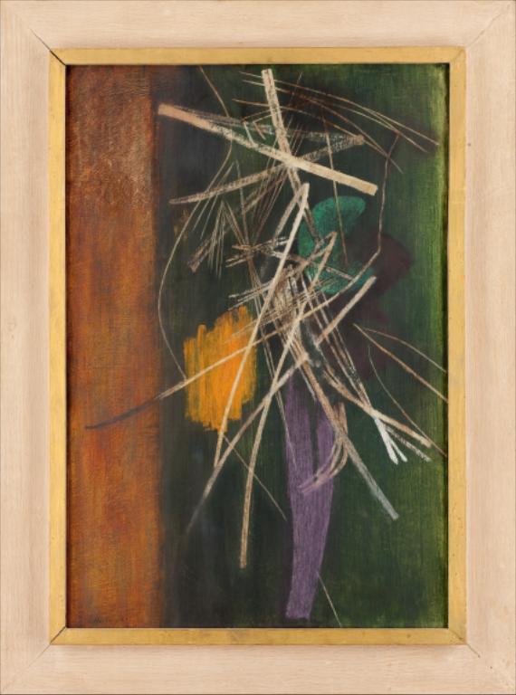 Artiste allemand naturalisé français au sortir de la Seconde Guerre mondiale, Hans Hartung est un précurseur de l’art informel parisien de l’aprèsguerre. D’abord inscrit à l’Académie des beaux-arts de Dresde, il découvre, lors d’un séjour à Paris en 1926, la peinture moderne française à l’Exposition internationale puis étudie brièvement à l’académie d’André Lhote (1885-1962) ainsi que dans l’atelier de Fernand Léger (1881-1955). C’est dans la capitale qu’il rencontre en 1929 la peintre norvégienne Anna- Eva Bergman, qu’il épouse une première fois (après leur divorce en 1938, il l’épouse à nouveau en 1957). Durant les années 1930, qu’il passe entre la France et l’Allemagne, il élabore progressivement sa méthode picturale, qualifiée de « spontanéité calculée » : sa peinture, qui semble retranscrire la spontanéité et la rapidité du geste, s’appuie en réalité sur des dessins préalables au tracé vif et automatique, ensuite mis au carreau, agrandis et transposés sur la toile. Composition fut réalisée durant une période difficile pour Hartung, qui, engagé durant la guerre dans la Légion étrangère, doit être amputé de la jambe droite à la suite d’une blessure au front en 1944. En 1945, dans un grand dénuement physique et moral, il apprend que nombre de ses oeuvres des débuts, restées à Leipzig chez sa soeur, ont été détruites. Il regagne alors son atelier à Arcueil, et affine son travail abstrait. Celui-ci est révélé lors de la première exposition personnelle de Hartung à la galerie Lydia Conti en 1947, qui signe les débuts de sa reconnaissance artistique : le critique d’art Jean-José Marchand écrit ainsi au sujet du peintre qu’il « est le seul de tout le Salon (avec Arp), qui donne une impression de liberté absolue vis-à-vis des théories ». Hartung connaîtra par la suite une consécration internationale avec le grand prix de la biennale de Venise en 1960, année qui ouvre une phase d’expérimentation picturale à travers l’utilisation de l’aérosol et du spray. Composition révèle un répertoire graphique auquel le peintre reviendra fréquemment, constitué de signes relevant d’une calligraphie personnelle rythmée, faite de saccades et de vrilles, se développant sur des bandes chromatiques verticales au sein d’une construction spatiale dynamique. Ce tableau a appartenu à Georges Desmouliez (1917-2004), conseiller municipal délégué aux beaux-arts et aux affaires culturelles de Montpellier, qui a défendu avec passion l’art abstrait de l’école de Paris dans la ville méridionale