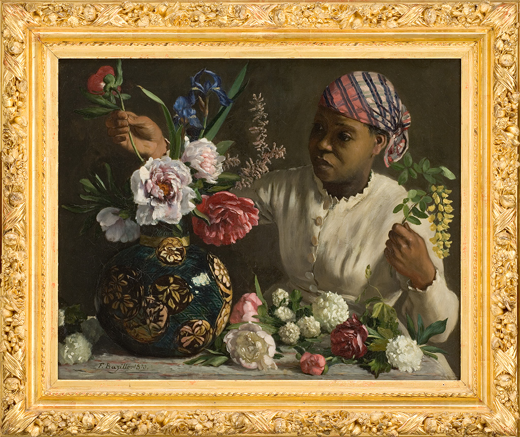 Après avoir peint en 1868 pour ses cousins Teulon l’élégant et mondain Vase de fleurs sur une console du musée de Grenoble, Frédéric Bazille aborde à nouveau ce thème durant la dernière année de sa brève existence. L’artiste a été profondément influencé par les tableaux de fleurs d’Édouard Manet, découverts au début de son séjour parisien, mais sans doute aussi par ceux réalisés par Eugène Delacroix et Gustave Courbet. Bazille semble vouloir combiner ici une scène de genre avec une nature morte selon une tradition bien ancrée dans la peinture européenne (dans les Flandres, à Naples…) depuis le xviie siècle. Le peintre adjoint à son tableau une femme qui est certainement la même que celle que l’on voit agenouillée à gauche au premier plan de La Toilette. Bazille réalisa une première version de sa composition (Washington, National Gallery of Art) qui montre la femme noire tournée vers le spectateur, présentant de la main droite un bouquet de pivoines. La version du musée Fabre, entreprise un peu plus tard, vers la fin du printemps 1870, met tout autant en valeur la sensualité colorée des fleurs mais insiste davantage sur l’action et l’intimité de la scène : le modèle, dont le buste émerge plus clairement de derrière la table, est occupé à agencer le plus soigneusement possible le bouquet qu’elle contemple avec une concentration extrême. Elle est sur le point d’introduire une tige de pivoine dans le vase d’où jaillissent déjà de grosses pivoines roses et rouges, des iris bleus et un rameau de tamaris. De la main gauche, elle garde en réserve un rameau de cytise. Devant elle, sur la table, reposent des fleurs en désordre, boules de neige et pivoines. Le fond neutre du tableau, la figure sobrement vêtue, le visage fermé, légèrement dans l’ombre, font ressortir avec un éclat et une ivresse incomparables la guirlande de fleurs qui se mélange avec bonheur à la panse généreuse et fleurie du vase. Celui-ci, dû à Laurent Bouvier et prêté par Henri Fantin-Latour, apparaît sur le bord de la table dans Un atelier aux Batignolles (1870, Paris, musée d’Orsay) exécuté par ce dernier. Les reflets dorés du visage qu’exalte encore le jaune pâle du cytise, les effets moirés du foulard auxquels répondent les luisances du vase, le clair-obscur prononcé achèvent de donner à l’ensemble une extraordinaire présence en même temps qu’un sentiment de jubilation qui est le signe d’une modernité retrouvée. Par son exubérance, sa sensualité, mais aussi par son caractère énigmatique, le chefd’oeuvre de Bazille rivalisait une dernière fois, avec brio, avec l’Olympia de Manet (1863, Paris, musée d’Orsay) qui montrait à l’arrière-plan, à droite, une servante noire présentant un bouquet composé, enveloppé par un fleuriste.