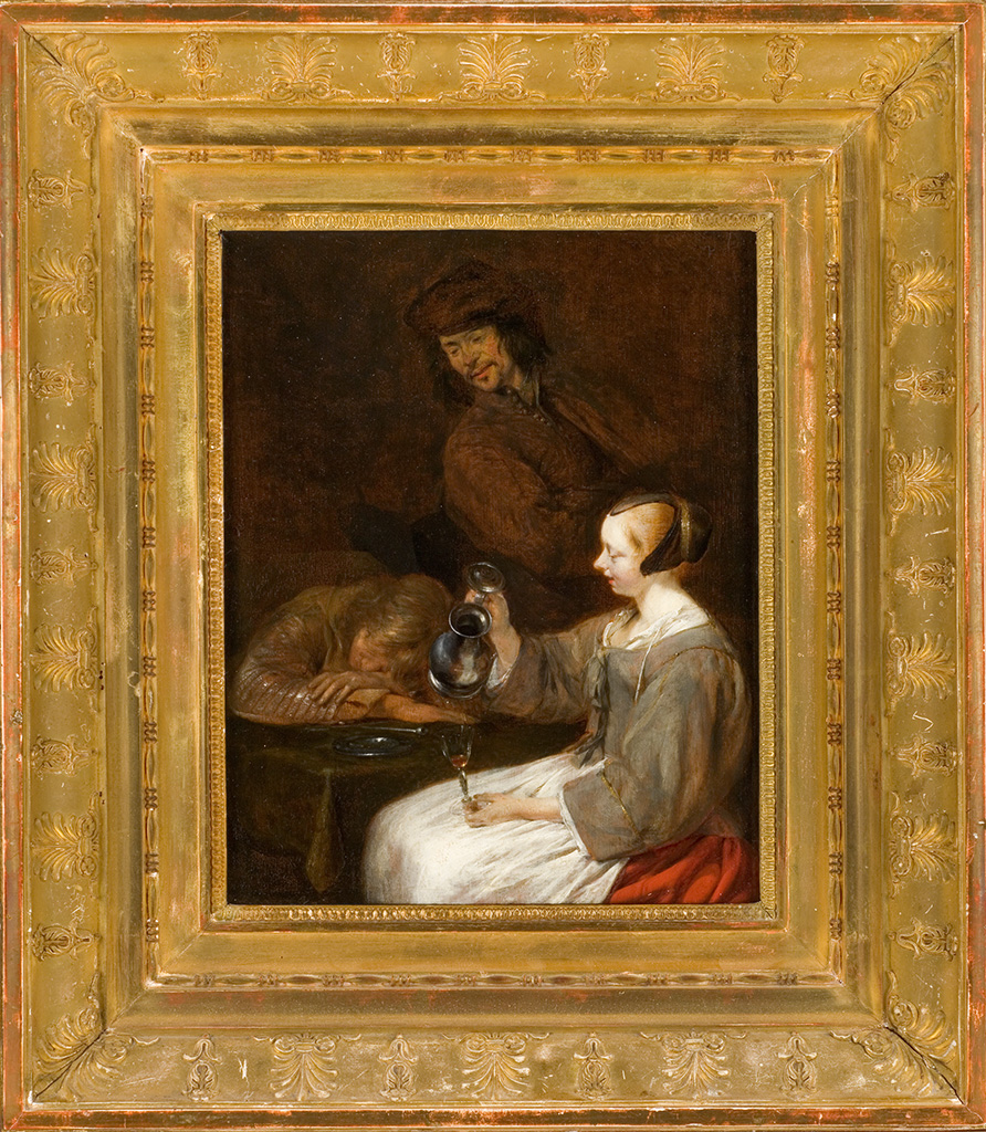 À la fin des années 1640, Ter Borch peint des scènes de taverne et de corps de garde, sujets souvent traités par Adriaen Brouwer (vers 1605/1606-1638) et David Teniers le Jeune dont il a pu voir de nombreux exemples lors de son passage en Flandres. Ce tableau important constitue le point de passage pour Ter Borch entre ses scènes populaires et ses scènes mondaines et élégantes qui feront sa renommée : en effet, il adopte déjà la formule des personnages vus à mi-corps dans un cadrage resserré et le fond neutre qui ne disperse pas l’attention sur des accessoires, réduits ici à une table et des couverts. Cette économie de moyens était très novatrice et a marqué de nombreux peintres, de Frans van Mieris à Johannes Vermeer (1632-1675). La jeune servante de taverne – ou de bordel – sert à boire et a certainement enivré le soldat endormi que regarde avec un sourire moqueur le troisième larron (ce personnage est d’ailleurs apparu sous un grand repeint lors d’une restauration en 1997) : le dormeur a bu et fumé – on voit une pipe blanche en écume sur la table. L’action narcotique du tabac et de l’alcool était mise en cause par les moralistes et cette peinture a pu être vue comme une mise en garde contre l’intempérance. Mais elle est avant tout un plaisant jeu ironique sur la psychologie des personnages. L’expression de la jeune servante est séduisante mais énigmatique : se réjouit-elle d’avoir joué un tour à son client, d’avoir vidé avec lui le pichet, de se servir à boire ? L’homme debout est-il son comparse ? C’est d’ailleurs l’une des premières fois que Ter Borch peint une figure regardant par-dessus l’épaule d’une autre, suscitant de fait chez nous l’impression d’assister à la scène. Le col ouvert du pichet qui intrigue au centre de la composition, la facture souple et très enlevée du costume au coloris subtil de la servante, son profil rayonnant font de ce tableau un chef-d’oeuvre