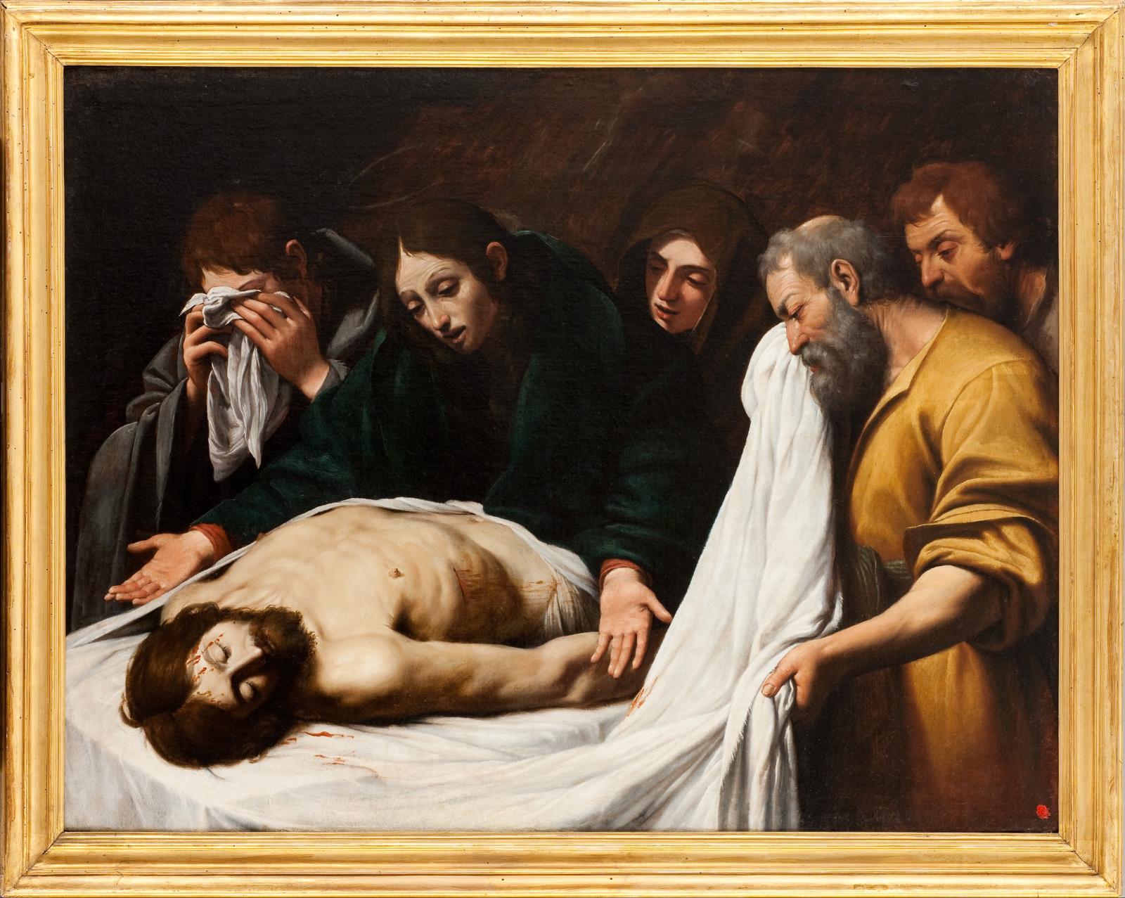 Révélé en 2012 à l’occasion de la grande exposition « Corps et ombres. Caravage et le caravagisme européen » (Montpellier, Toulouse), ce tableau de provenance prestigieuse (les collections Chigi à Rome) permet de mieux appréhender la diffusion rapide du caravagisme peu après la disparition du maître en 1610. L’épisode narré par les quatre évangélistes illustre le moment où Jésus, descendu de la Croix, est roulé dans un linceul et pleuré par saint Jean, la Vierge, Marie-Madeleine, Nicodème et Joseph d’Arimathie. Ce dernier, disciple en secret de Jésus, avait obtenu l’autorisation d’ensevelir sa dépouille. Autour du corps du Christ, placé de biais sur un linceul recouvrant la pierre tombale, se tiennent les figures à mi-corps qui toutes réagissent à leur façon à cet événement inouï : douleur de Marie, les deux bras largement ouverts en direction de son fils, désespoir de Jean, le visage dissimulé dans un linge, émotion de Joseph d’Arimathie qui sèche ses larmes dans un pan du linceul, compassion de la Madeleine, dissimulée dans l’ombre, curiosité et empathie de Nicodème qui pointe sa tête à l’extrême droite de la composition. Les ombres denses, le cadrage rapproché, la sobriété de la palette colorée (avec ses accords de jaune, de vert et de grisbleu), la monumentalité de la composition, le franc naturalisme (la tête chevelue et ensanglantée du Christ tout près du rebord de la toile qui crée un contraste frappant avec le blanc immaculé du linceul) montrent que Spada a largement médité les retables de Caravage lors de son séjour à Malte, peu après le départ du maître, puis lors de son passage à Rome sur le chemin du retour (La Mise au tombeau de la Pinacothèque du Vatican, La Mort de la Vierge du musée du Louvre). Presque ébranlé par la révélation du naturalisme puissant et agressif de Caravage, Spada se rallie à son esthétique et nous livre ici une de ses créations les plus fortes, d’une intensité dramatique et émotionnelle unique dans son oeuvre.