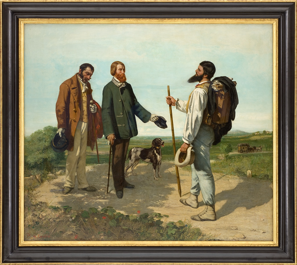 Universellement célèbre, véritable icône de l’art du xixe siècle français, La Rencontre immortalise l’arrivée à Montpellier du peintre au mois de mai 1854. Courbet avait quitté la diligence un peu avant la ville et avait rencontré son hôte accompagné de son domestique Calas et du chien Breton. La scène se situe non loin de la demeure d’Émile Mey (un ami de Bruyas) à quelques kilomètres de Montpellier, à l’intersection de la route de Sète et du chemin de Saint-Jean-de-Védas à Lattes, en direction de Mireval. En réalité, Courbet emprunta la récente ligne de chemin de fer et sa tenue vestimentaire légère, son attirail de peintre suggèrent plutôt qu’il s’en retourne d’une journée d’excursion sur le motif. Les indications topographiques restent floues et peu identifiables. Comme l’ont noté la plupart des commentateurs, cette rencontre se situe à l’évidence « sur le terrain de l’art ». Le tableau s’inscrit dans la continuité des achats et commandes de l’année précédente, en particulier du Tableau- Solution qui établissait un véritable pacte d’amitié et de collaboration entre l’artiste et le collectionneur. La composition claire et efficace selon un schéma tripartite hérité du néoclassicisme met en scène le chétif collectionneur, âgé de trente-trois ans, vêtu d’un élégant caban vert sombre et suivi de son domestique, confronté au robuste travailleur, de deux ans son aîné. Courbet, bien que décalé sur la droite, de profil, s’est donné le beau rôle avec son habit clair qui accroche la lumière, la belle tête sombre, la barbe « assyrienne » découpées sur le ciel, et le bâton solidement ancré dans le sol qui lui donne des allures d’apôtre des temps nouveaux, impatient de « débuter dans la grande vie vagabonde et indépendante du bohémien » (Francis Wey). Les deux hommes presque sur un pied d’égalité laissent deviner le lien d’interdépendance qui les unit : Bruyas a besoin du peintre en qui il a reconnu les qualités supérieures pour réaliser les oeuvres dont il a le projet ; Courbet, conscient de sa valeur, a besoin du soutien affectif et financier du Montpelliérain, homme de goût fortuné. En élevant au rang de la peinture d’histoire un fait divers de caractère privé, somme toute banal, Courbet poursuivait son oeuvre de sape et de renversement des hiérarchies établies. Le thème de la rencontre avait d’ailleurs une riche iconographie, en particulier religieuse, que Courbet ne pouvait pas ignorer (Éliézer et Rébecca ; Salomon et la Reine de Saba ; Visitation de la Vierge Marie, etc.). Le schéma général de la composition lui a été suggéré par une estampe populaire, Les Bourgeois de la ville parlant au juif errant, gravée par Pierre Leloup du Mans en 1831. Son ami Champfleury la reprendra en frontispice de son ouvrage fondamental paru en 1869, Histoire de l’imagerie populaire. À travers Champfleury, découvreur des frères Le Nain, Courbet a pu être mis en contact avec leur art dans lequel on trouve déjà des silhouettes hiératiques, comme à l’arrêt, « monumentalisées » devant la vaste plaine picarde. Le voyage de Courbet en Hollande en 1846, si déterminant pour l’affirmation de son réalisme, a pu lui fournir maints exemples notamment à travers les paysages d’Albert Cuyp (1620-1691). À ces sources probables, il convient d’ajouter l’extraordinaire pouvoir d’évocation de la pâte colorée : fluide, déliée avec de savoureux empâtements qui préservent la fraîcheur de l’esquisse sur le motif ou au contraire solide et ferme, selon l’enseignement des maîtres hollandais ou espagnols que Courbet admirait. Le tableau entre dans la légende lors de sa présentation à l’Exposition universelle de 1855 ; il « fait un effet extraordinaire » selon les dires du peintre et provoque la verve des caricaturistes et la hargne des critiques. Bruyas, blessé, soustrait le tableau à la vue du public jusqu’à sa donation au musée Fabre en 1868. Enfin, Théodore de Banville, parodiant Victor Hugo, s’inspira du tableau de Courbet dans une des Odes funambulesques : « Et le sombre feuillage évidé comme un cintre, Les gazons, le rameau qu’un fruit pansu courbait, Chantaient : “Bonjour, Monsieur Courbet le maître peintre ! Monsieur Courbet, salut ! Bonjour, Monsieur Courbet !” »