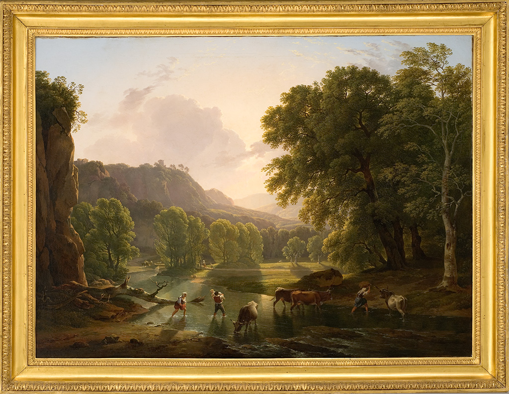 Ce paysage monumental, qui appartint à la comtesse d’Albany avant d’entrer en possession de Fabre, est l’un des rares tableaux de Voogd, important paysagiste hollandais de la colonie d’artistes cosmopolites installés à Rome à la fin du xviiie siècle : arrivé en Italie en 1788, il y reste jusqu’à sa mort. En compagnie de Johann Christian Reinhart (1761-1847), il dessine sur place les sites de la campagne romaine et compose en atelier des paysages qui, à l’époque où il exécute notre oeuvre, constituent une synthèse réussie des traditions du xviie siècle, issues du Français Claude Lorrain (vers 1604/1605-1682) et des Hollandais italianisants Herman van Swanevelt (vers 1603-1655), Nicolaes Berchem (1620-1683) et Jan Asselijn (vers 1614-1652). La lumière vespérale, le jeu équilibré et serein des lignes verticales et horizontales sont un hommage de Voogd, surnommé le « Claude hollandais », à son modèle. La lumière, plus enveloppante que chez ce dernier, nourrit l’ensemble des teintes du paysage, admirablement rendue même dans ses effets dissolvants des formes, telles celles de la tour de guet qui surmonte la colline au second plan. L’ampleur, le jeu pittoresque des plans montrent qu’il a étudié aussi Swanevelt. Au demeurant, Voogd donne aux arbres une présence qui témoigne de son intérêt pour le naturalisme hollandais à la manière de Jacob van Ruisdael (vers 1628-1682). Ce paysage majestueux, de composition classique, sert de cadre à une scène pastorale inspirée de Berchem et d’Asselijn, peintres de nombreuses traversées du gué par un troupeau. Les bergers de Voogd sont vêtus du costume traditionnel du Latium, avec la coiffe plate pour les femmes, et possèdent une force et une carrure bien adéquates, différentes de la grâce un peu maniériste de ceux de Berchem. Remarquable animalier dans la tradition de Paulus Potter, le peintre a bien observés les animaux, et ses boeufs ont les cornes effilées de ceux qui sont élevés dans la campagne romaine
