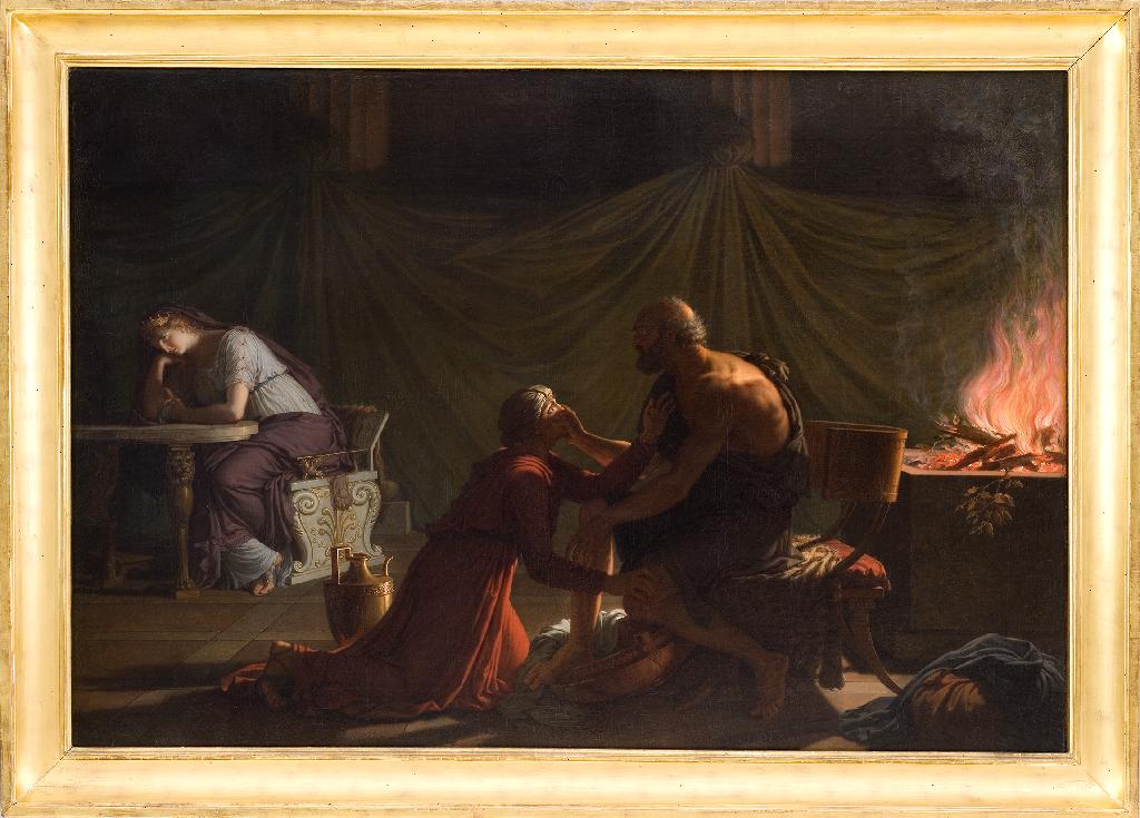 Ce tableau, heureusement réapparu à l’occasion d’une exposition à Milan en 2002, permet de mieux cerner la personnalité de Fabre dans les années cruciales qui suivent son installation à Florence. Malmené par les événements politiques, contraint de s’adapter aux exigences du portrait mondain, Fabre revient à sa vocation première de peintre d’histoire à la faveur de commandes émanant de clients étrangers. Le sujet est emprunté au chant XIX de l’Odyssée d’Homère : au moment où Ulysse regagne sa patrie, la nourrice Euryclée est l’une des premières personnes à le reconnaître en voyant, alors qu’elle lui lave les pieds, une cicatrice qui lui rappelle la blessure ancienne d’un sanglier faite « en suivant au Parnasse les fils d’Autolycos ». C’est alors que le héros plaque sa main droite sur la bouche de la nourrice et lui intime l’ordre de ne pas révéler son identité. Dans le fond, à gauche, on reconnaît Pénélope qui médite, songeuse et émue, le récit que le mendiant (Ulysse) vient de lui faire sur l’époux disparu. La sobriété du décor, avec la colonnade et la lourde draperie, rappelle David, le maître de Fabre (notamment La Douleur d’Andromaque), mais traduit aussi une bonne connaissance de bas-reliefs antiques de même sujet, connus par la gravure (Monumenti antichi inediti de Winckelmann). À travers le mobilier (chaise curule, guéridon, trône), Fabre fait étalage de sa science archéologique, ponctuée d’une note de préciosité qui lui est coutumière. Le clair-obscur dramatique souligne l’intensité de l’échange entre les protagonistes de la scène – le brasier, la tunique incandescente d’Euryclée, la jarre dorée – et s’oppose au groupe de Pénélope, enlevé dans une gamme plus froide. Dans ce tableau empreint d’un charme mystérieux qui renvoie aussi à Poussin pour l’analyse des passions humaines, Fabre se laisse aller à une stylisation accrue et à un goût « primitiviste » qui s’affirme dans son oeuvre à partir des commandes pour lord Holland, en 1796, et qui ira en s’accentuant jusqu’au Saül, en 1803, qui clôt en quelque sorte la période de jeunesse