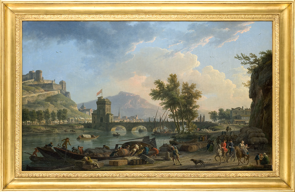 Ce tableau a été peint avec son pendant conservé au musée du Louvre, La Construction d’un grand chemin, pour l’abbé Joseph Marie Terray (1715-1778), contrôleur général des Finances et directeur des Bâtiments du roi de 1773 à 1774. Dans la continuité de l’oeuvre de Charles Trudaine (1703-1769), Terray favorisa la construction d’équipements publics, comme les routes, les canaux, les ponts et le développement des foires commerciales pour dynamiser l’économie en facilitant la circulation des hommes et des biens sur tout le territoire. Il a aussi commandité des oeuvres d’art célébrant ces progrès, dont les deux pendants de Vernet, emblématiques de l’oeuvre modernisatrice du siècle des Lumières. Auparavant intitulé La Foire à Beaucaire, ce paysage est imaginaire et s’inspire de sites du sud de la France d’où est originaire Vernet. Dans cette ville méridionale au bord d’un large fleuve, qui pourrait être le Rhône ou la Durance, s’est installée une foire dont on distingue les chapiteaux et les portants d’un théâtre. Le pont est large et moderne, référence aux ouvrages d’art novateurs du célèbre ingénieur des Ponts et Chaussées, Jean Rodolphe Perronet (1708-1794). Les grandes barques de transport de marchandises, les ballots, tonneaux, colis, l’animation humaine fébrile achèvent de faire de cette peinture un condensé exemplaire de la politique volontariste de l’Ancien Régime en matière de commerce et d’équipement public. Vernet compose une vue panoramique d’une grande largeur de respiration, qui lui permet de réunir l’étendue des activités voulues par son sujet. Il peint les différents plans avec un grand souci des effets atmosphériques et la lumière est d’une intensité toute méridionale. Les figures et tous les détails (architecture, marchandises, costumes…) qui rendent probante la représentation sont parfaitement intégrés au paysage